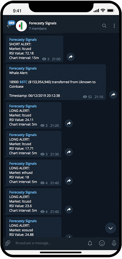 We provide high-quality cryptocurrency trading alerts in realtime - allowing you to stay up-to-date whilst spending minimal time staring at charts. Forecasty is a completely automated signals service for cryptocurrency markets. We assess data and relay useful information back to our users which can then be used as a basis for successful trades. This includes a range of tried and tested indicators such as the RSI, MACD, psychological price barriers and more - allowing you to glance at your notifications and gain insight into market sentiment without the need to stare at charts all day.