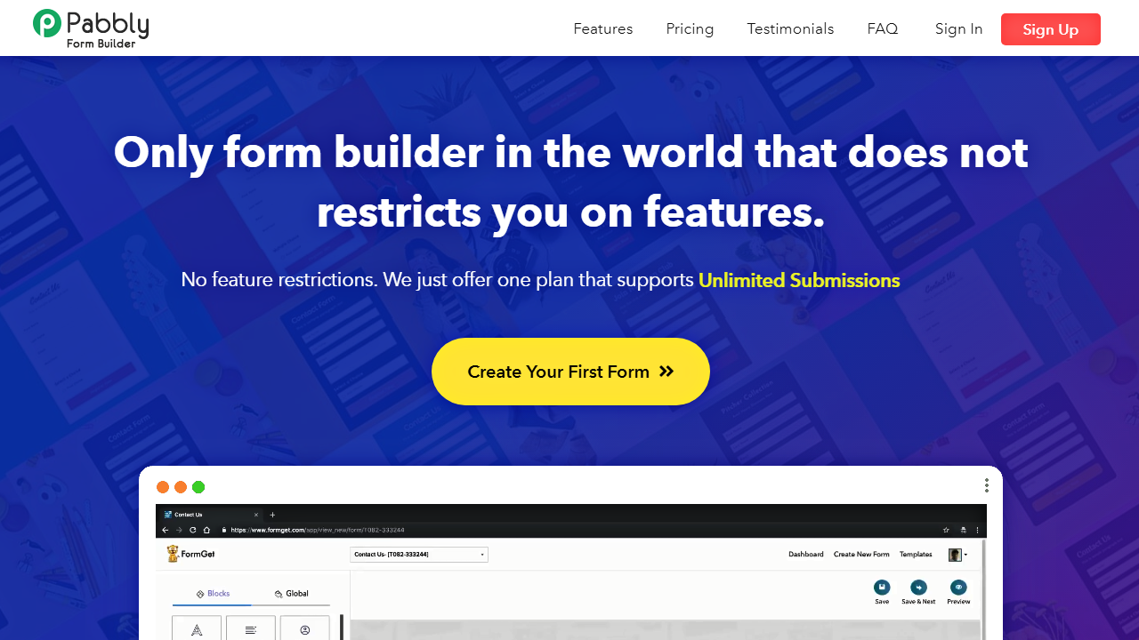Pabbly Form Builder is an online form builder through which you can design any type of form without writing a single line of code. It offers number of advanced features like canned replies, team management, email notifications, conditional logic, and many others that make your form more powerful. Pabbly Form Builder can be integrated with giant payment gateways such as PayPal & Stripe so you can collect payments from the customers securely. Pabbly Form Builder Pricing:- Plan A:- $10/ month Key Features:- All Extensions Applicable for 1 Form, Create Unlimited Forms, Unlimited Leads, Unlimited Users, Collect Payments via PayPal & Stripe, Email Notification, Unlimited Storage Available, Autoresponder, Conditional Logic Forms, Google Analytics & Tracking, Export Data etc. For more pricing information, you can visit Pabbly Form Builder's official website - https://www.pabbly.com/form-builder/