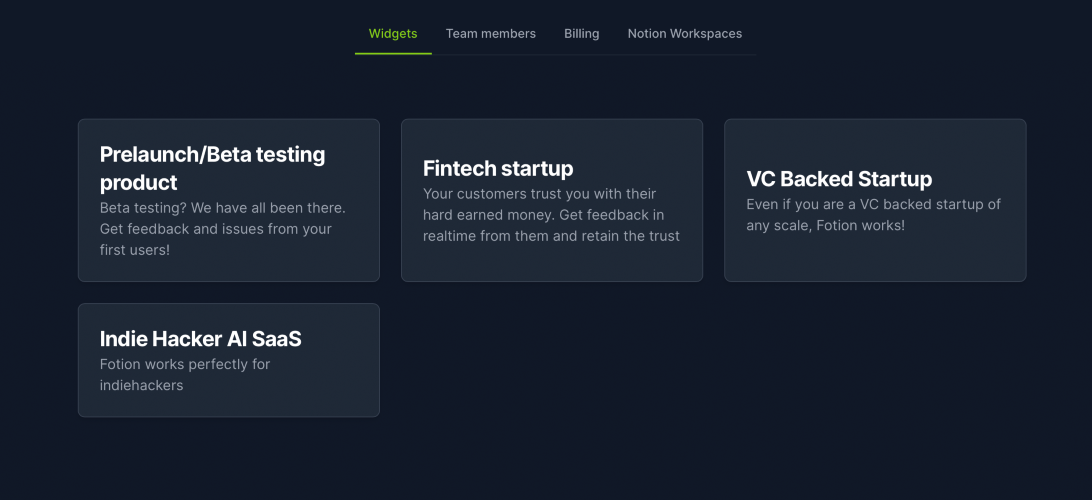 Fotion is a user feedback tool that allows your users to submit feedback or bug reports to you. These feedback are stored inside your Org's or Personal Notion's database instead of a third party ( our ) database. This has the side effect of giving you unlimited feedback submission.