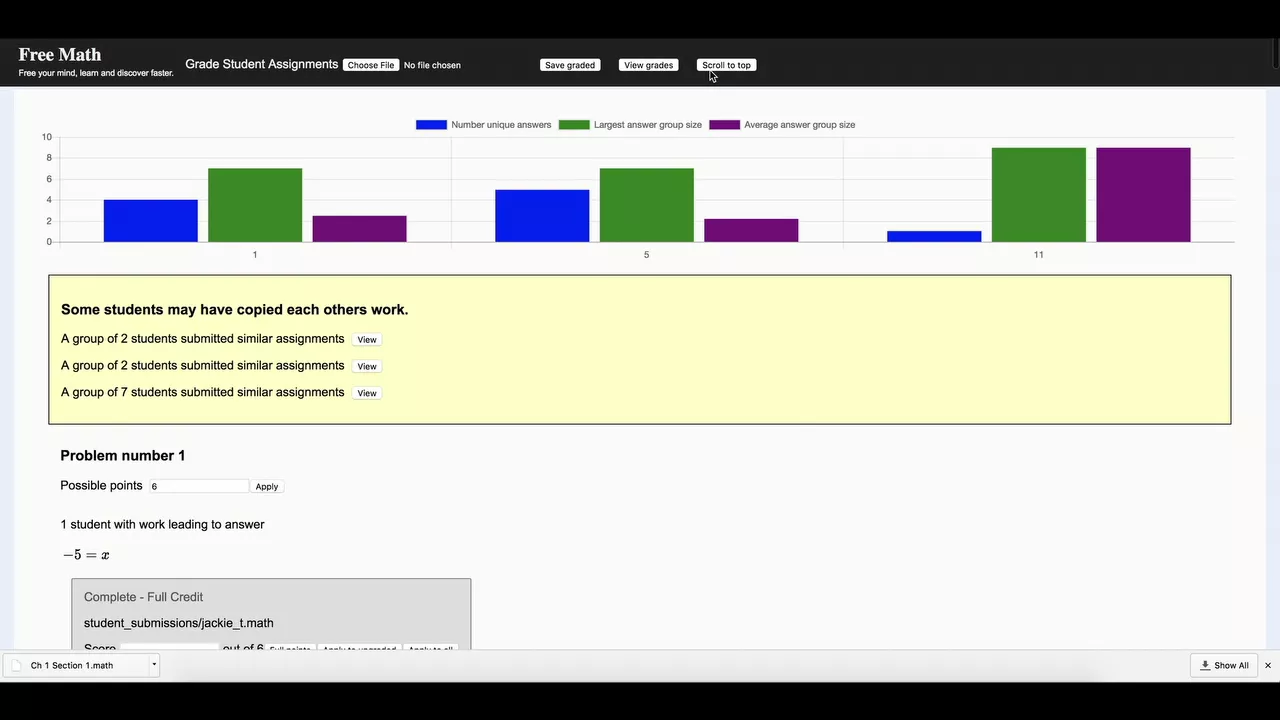 Students digitally record step-by-step math work. No account setup required, free for teachers and students. Work saves as files on your local device, share docs through your existing course management solution. Teachers load all students docs for simultaneous grading, reviewing complete solutions, grouped by similar final answer. Provide targeted feedback before a test or quiz, and improve daily communication with students.