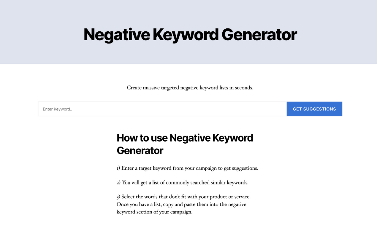 Free Negative Keyword Generator to stop bleeding your Google Ads Account. - Create Massive Targeted Negative Keyword Lists in Seconds. - Save Your Google Ads Campaign from Getting Irrelevant Clicks. - Save Hundreds of Hours to Create Negative Keyword Lists.