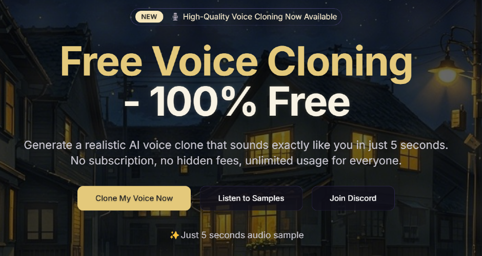 Generate a realistic AI voice clone that sounds exactly like you in just 5 seconds. No subscription, no hidden fees, unlimited usage for everyone.