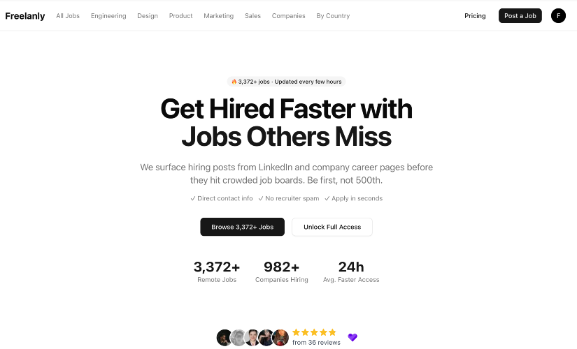 Freelanly helps freelancers and remote workers find opportunities faster by surfacing jobs from LinkedIn posts and company career pages before they hit crowded job boards. For Freelancers: • Get direct access to clients posting projects on social media • Skip the competition on traditional freelance platforms • Connect directly with decision-makers For Full-time Remote Workers: • Access fresh job listings updated every few hours • Get direct contact info for hiring managers • Apply before 500 others do on traditional job boards Features: • 3,300+ remote jobs across engineering, design, marketing, sales and more • Filter by level, country, salary, and skills • Direct email access to hiring managers • New jobs added every few hours • Works worldwide - US, UK, Germany, Canada, and more Stop competing with hundreds of applicants. Start getting interviews faster with Freelanly.