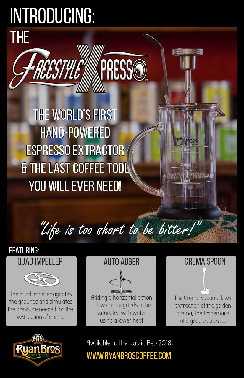 Introducing the World's first Hand Powered Espresso Extractor! Designed to remove the need for power-hungry, expensive espresso machines that are difficult to repair, this unique and powerful tool puts the skill and artistry back in your hands--literally! It's fast (Under 30 seconds)...it's simple...and it works extremely well! The Patent protected Utility & Design Patent (#9648979) has been tested in our coffee shops for the past 18 months, each unit pulling approximately 2,500 coffee shots a month. With no loss in quality, no repairs and no down-time for cleaning, the process has been embraced by both workers and customers alike, allowing for a greater variety of bean to be used without the bitterness of over-extraction. "I've never had an espresso shot made with an African Bean, I love that I can really taste the berry qualities...it's not overpowered by the bitter burnt taste from the machine." (John Moran, Espresso Machine Service Tech.)