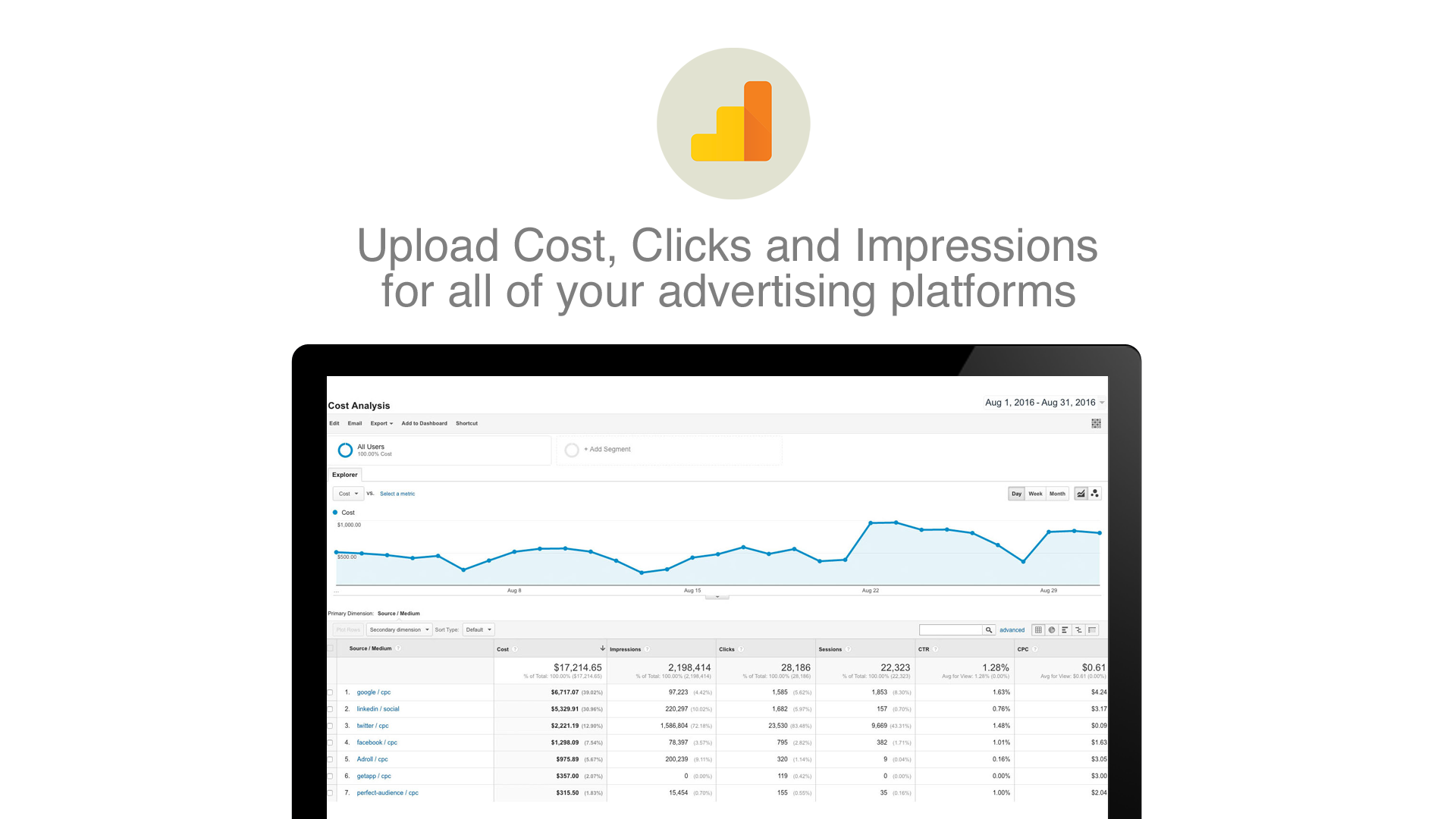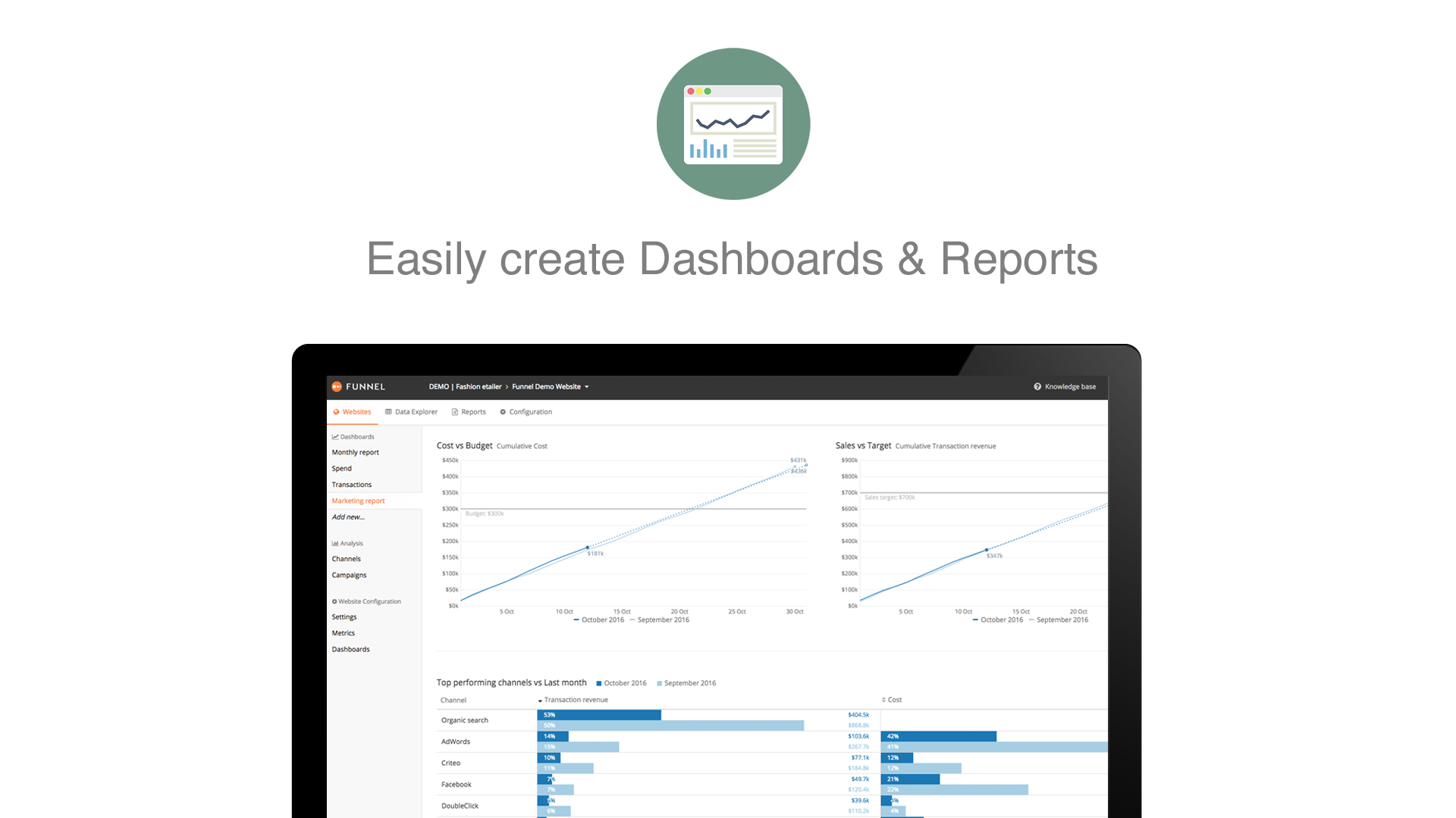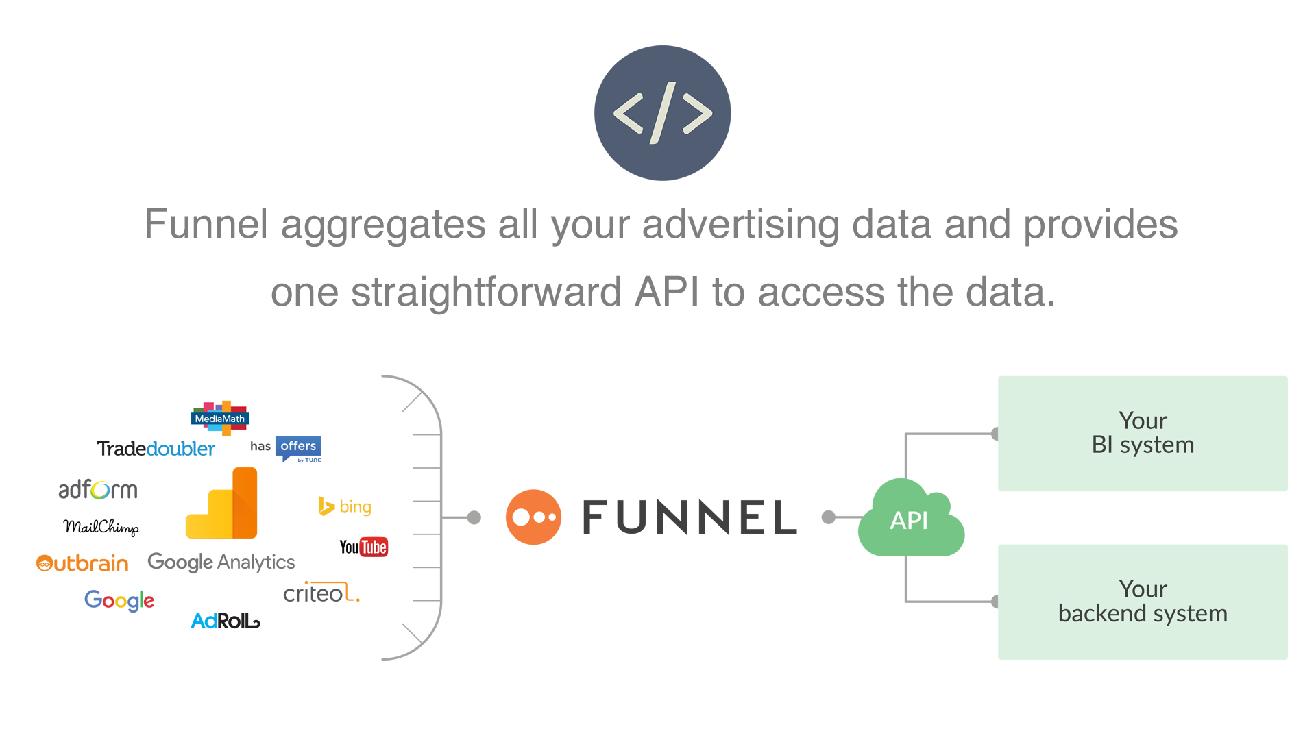Funnel pulls in cost data across all advertising platforms where you spend money and combines it with goals and transactions. Automating this process saves many hours of manual data collection and Excel processing, but more importantly increases return on advertising spend. The superpower of Funnel is that all data is in place from day one, it is also structured and combined in the way needed to make any sense of it. It does not require IT resources or a business analyst to create a new KPI dashboard or report, anyone can do it within minutes. Yes, it's really that simple.