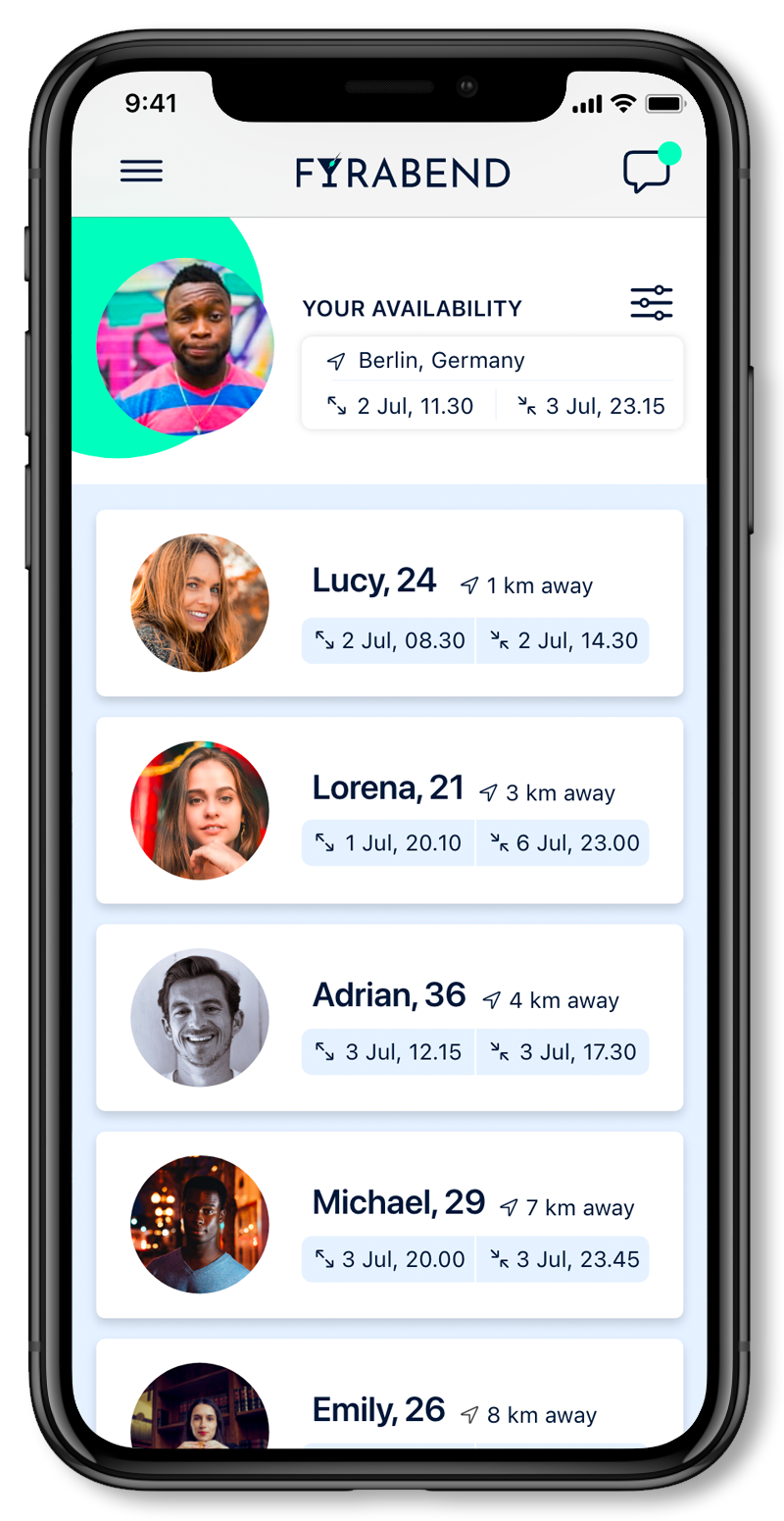 Fyrabend is a mobile app for iOS and Android, that aims to streamline the process of getting in touch with others while traveling. Ideal for everything traveling solo or for business or new in town. Everything's based on one's current availability (location, date, time) in order to make the process as easy and spontaneous as possible. Fyrabend is due to launch soon, sign up for the waitlist to be first in line: https://fyrabend.app.