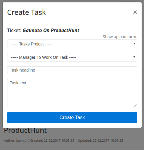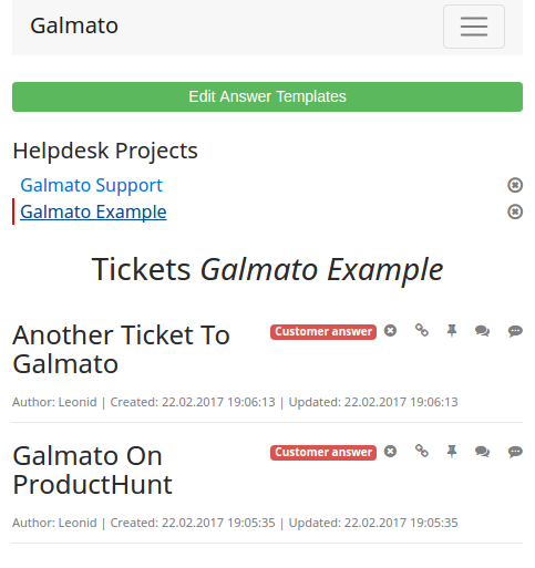 Hi everybody We would like to introduce you our new project called Galmato - Helpdesk and Task Manager In One Place Briefly - why we did it? There are two main advantages in our service First - for companies we offer not just only helpdesk but also task manager - in one place Usually company has to use two different services to do what we offer in one - for example BaseCamp|Asana etc + Freshdesk|Zendesk etc Moreover its not just helpdesk plus task manager - separately but in one place - there is an opportunity to link helpdesk ticket with tasks manager task Second - for customers we offer opportunity to get helpdesk support from as many companies as possible in one account - once registered customer can add different helpdesk projects from different companies - no need for customer to register many times