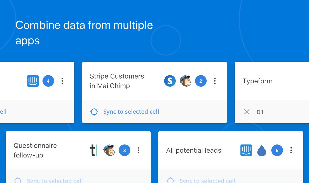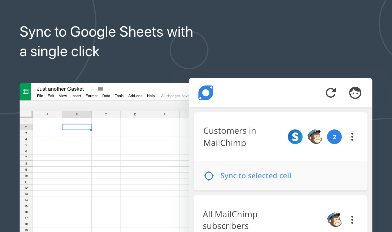 Stay up-to-date with data in your apps Without the messy data dumps Stop wrestling with your data Seeing subscribers, responses and prospects roll in is great. Yet, the hours spent getting datasets from each individual app into shape left us with little time for actual analysis. So we created Gasket. Teleporting your tidy data Gasket works as the middleman between your apps and Google Sheets. It applies the filters, joins and arrangement you defined. Just hit sync and watch the tidied data populate your spreadsheet. Automate your data wrangling Joins let you maintain the relationship between data fetched from different apps. A good example of this is making names line up with their correlating addresses from a different set of data. Sync to Google Sheets Once you’ve created your Gasket, sync it to Google Sheets to continue working in your favorite spreadsheet software. The Gasket add-on is the easiest way to keep your sheets up-to-date with your data sources.