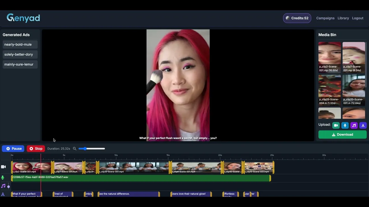 Genyad.com is an AI tool that creates new video ad variations by re-using your existing ad library. Instead of making videos from scratch, it analyzes your past video ads, breaks them into key "chunks" (like hooks, demos, and CTAs), and then automatically reassembles them into new combinations. It also adds new AI-generated scripts and voice-overs to create a high volume of fresh ads for testing.
