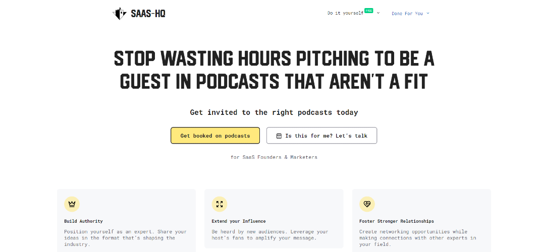 Done-for-you service for SaaS founders and marketers. We book them appearances on relevant podcasts to help them grow their businesses.
