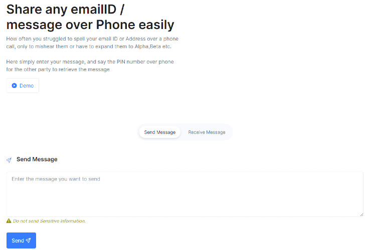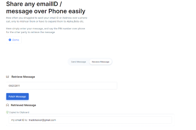 How often you struggled to spell your email ID or Address over a phone call, only to mishear them or have to expand them to Alpha,Beta etc. Here simply enter your message, and say the PIN number over phone for the other party to retrieve the message