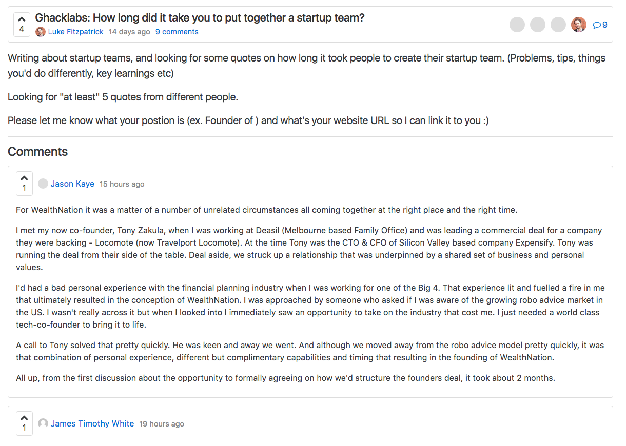 Ghacklabs is a new platform for people to get free PR. Journalists and bloggers can post up stories that they are writing about, and get quotes from people in real-time. Ghacklabs uses a combination of features from: - Reddit: Votes, comments, and moderators. - Quora: Sharing knowledge and making friends. - HARO: Getting quotes and giving quotes for news articles and blogs. Content creators can also use Ghacklabs to "co-create content" together, allowing bloggers to create content faster in the crowd. If you'd like to get in touch, do not hesitate to contact me via [email protected]. Website: http://ghacklabs.com/ Blog: http://blog.ghacklabs.com/ Facebook: https://www.facebook.com/ghacklabs/ Twitter: https://twitter.com/ghacklabs Instagram: https://www.instagram.com/ghacklabs/ Pinterest: https://au.pinterest.com/ghacklabs/ LinkedIn: https://www.linkedin.com/company-beta/7953453/ CrunchBase: https://www.crunchbase.com/organization/ghacklabs#/entity