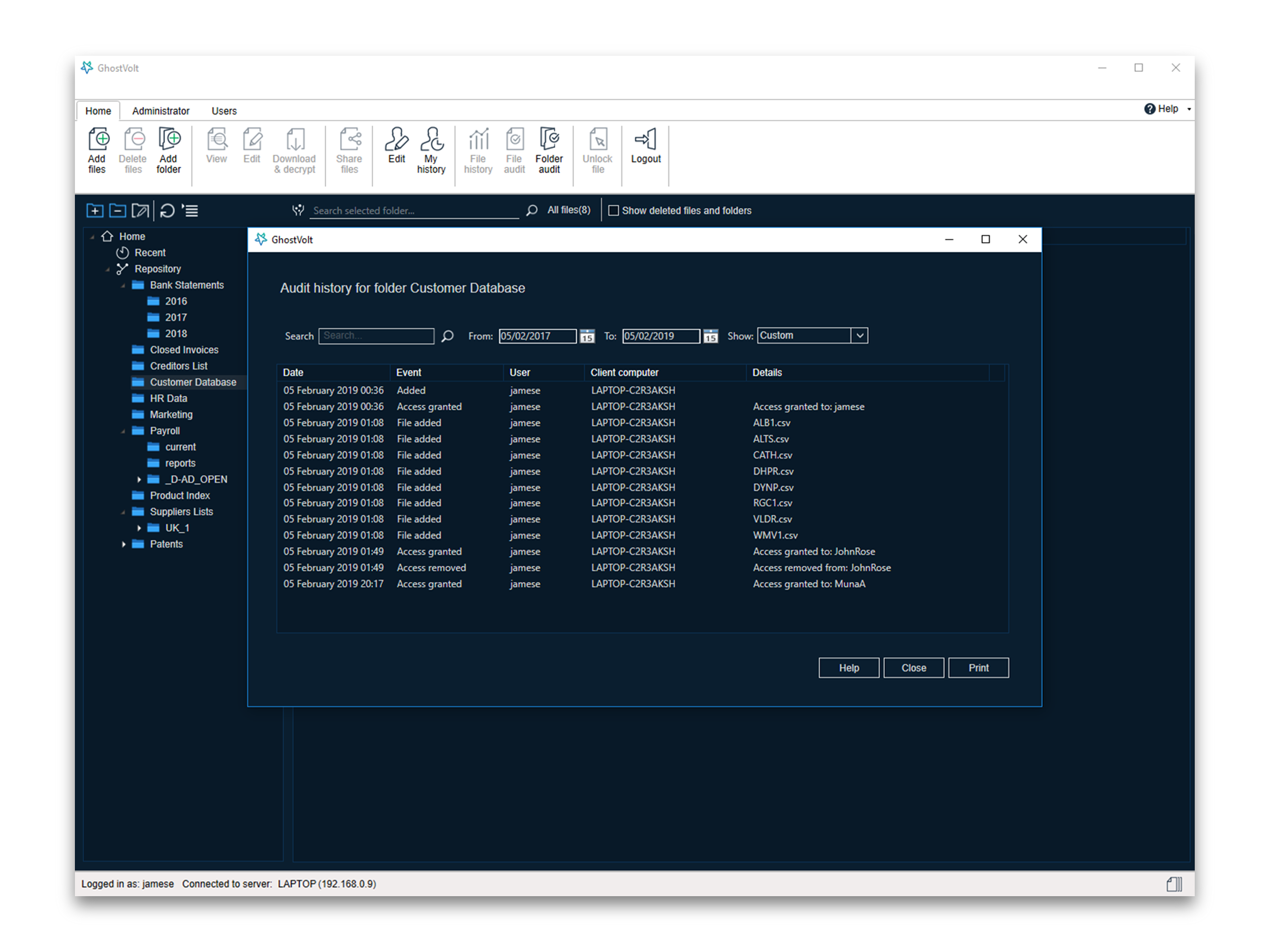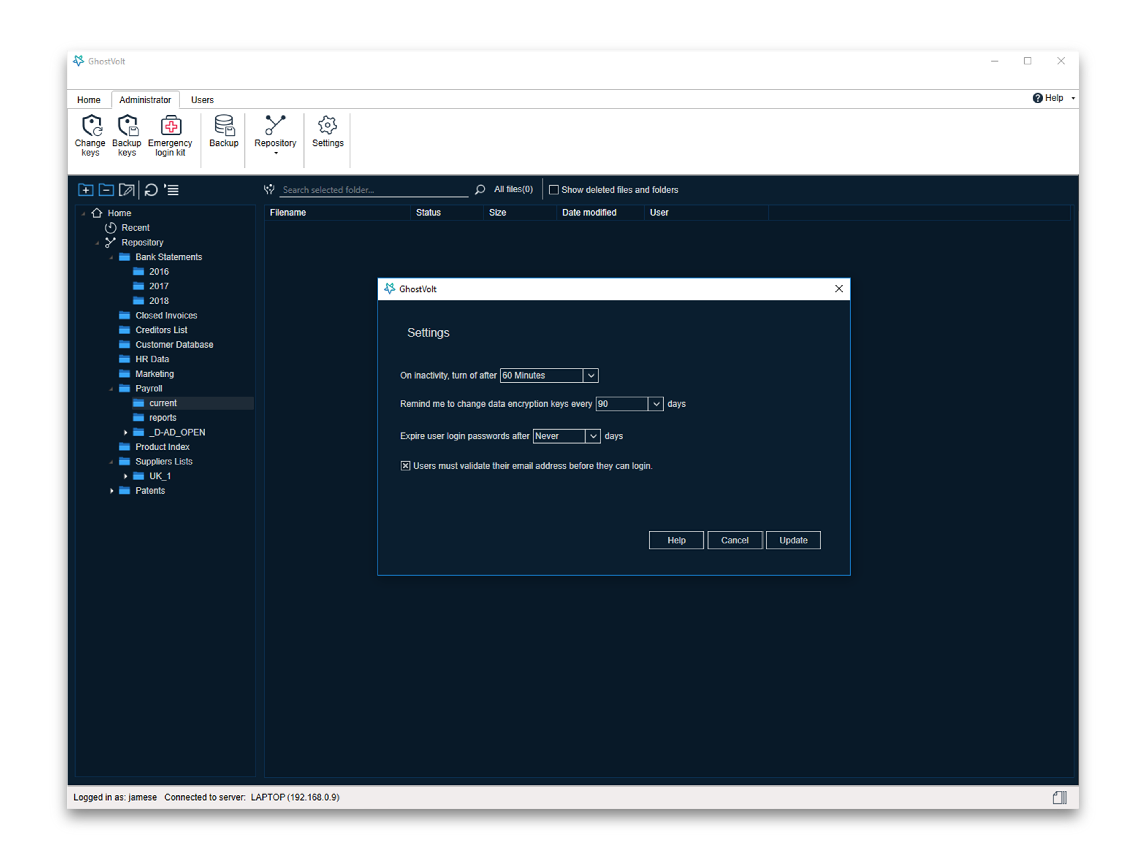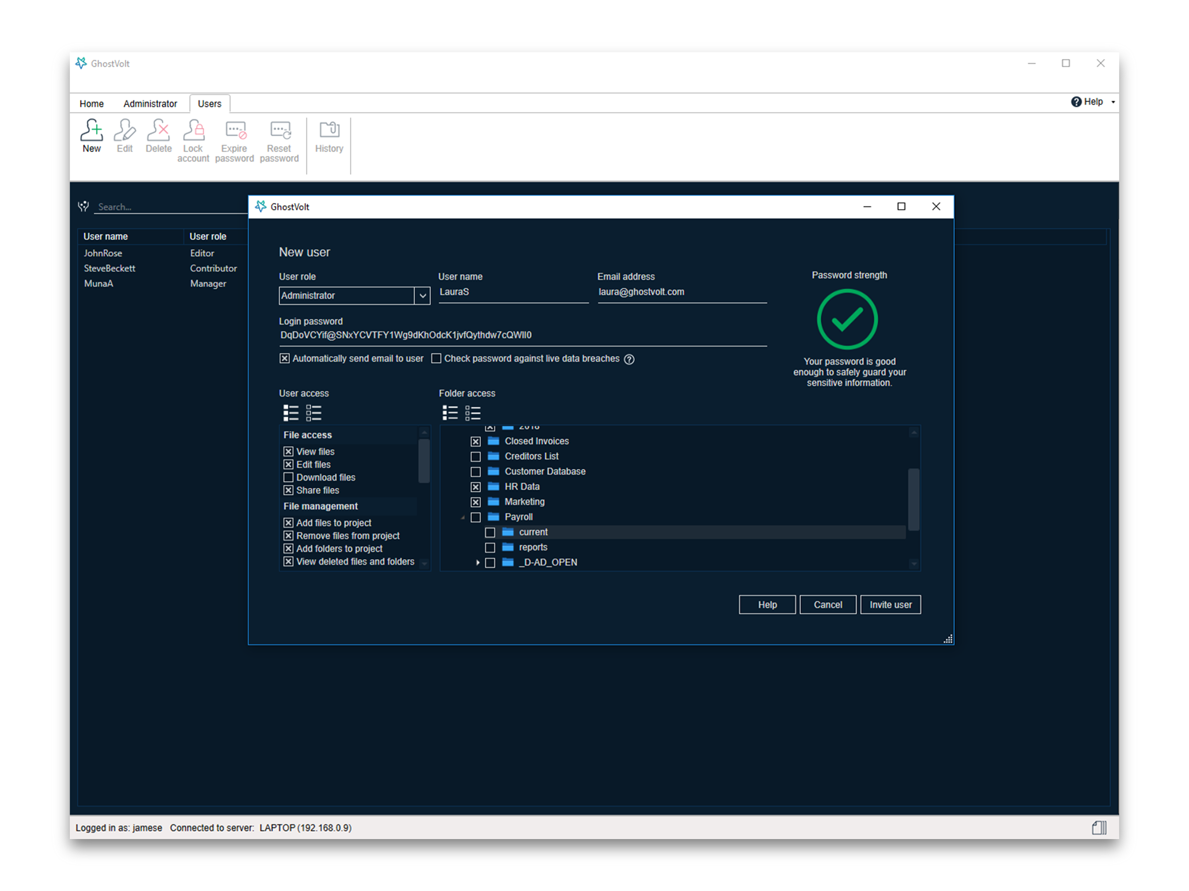 GhostVolt is an encryption solution that provides: Automated Encryption: GhostVolt takes care of encryption at every point on your network, automatically, so you don’t have to. Collaboration: Invite everyone on your network to join your GhostVolt Team and enjoy the seamless work-flow your business depends on. Asset Restriction: Assign special user access permissions for your team and give them controlled access to your assets User Control: Assign special user access permissions for your teams or create your own for each member, and give them controlled access to the folders of your choice. Reporting: Run reports in GhostVolt for full insights on your teams user accounts, history and actions. Or audit the history of every asset your team uses, even the deleted ones. Grows with your Organization: GhostVolt is fully scalable. Just add more users to your team as you grow, or add servers to meet the needs of your expanding business, whatever the size.