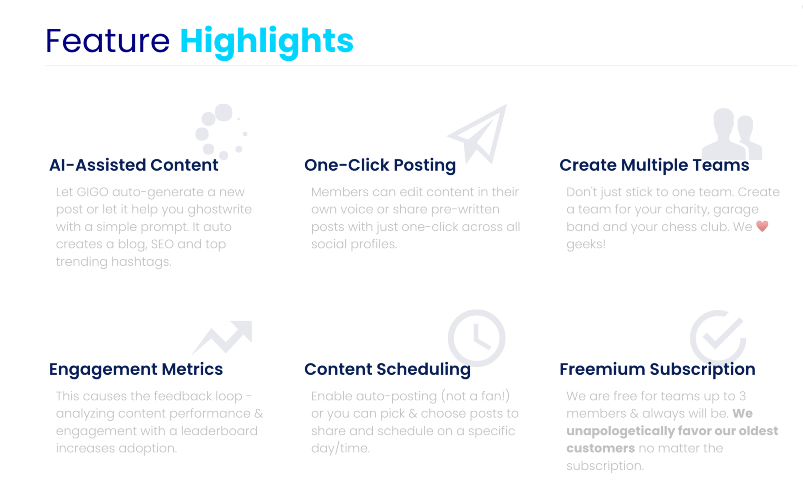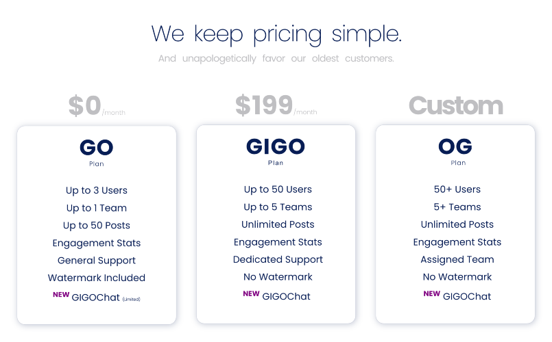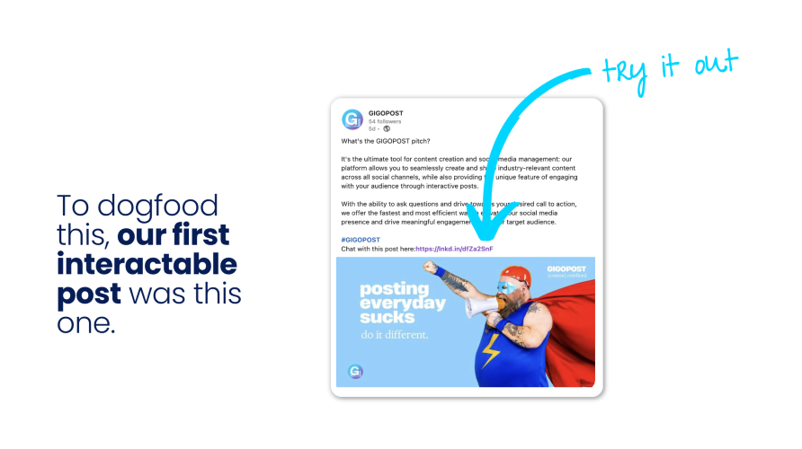 Gigopost is the fastest way to create & share INTERACTABLE content everywhere. Gigopost is a cutting-edge platform designed to streamline and enhance the management of social media content for businesses and individuals. Since its inception, Gigopost has focused on providing an intuitive and powerful solution for scheduling, monitoring, and analyzing social media posts across multiple platforms. With the rapid evolution of digital marketing, Gigopost has continually adapted, ensuring its users can maximize their online presence and engagement. NEWEST FEATURE Introducing GigoChat: A Game-Changer in Customer Engagement In response to the growing demand for more interactive and personalized customer experiences, Gigopost has launched a groundbreaking new feature called GigoChat. This innovative tool is designed to enhance customer engagement by integrating advanced domain specific LLM technology into the Gigopost platform. GigoChat leverages artificial intelligence (AI) to provide real-time, automated interactions with customers across various social media channels, blogs, Youtube..literally anywhere!