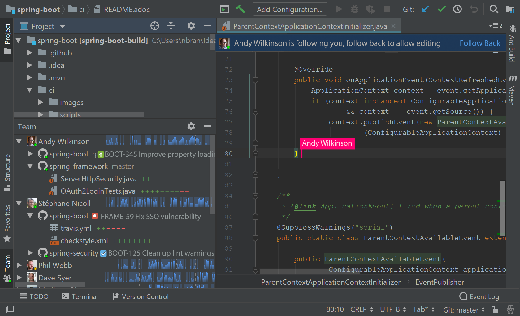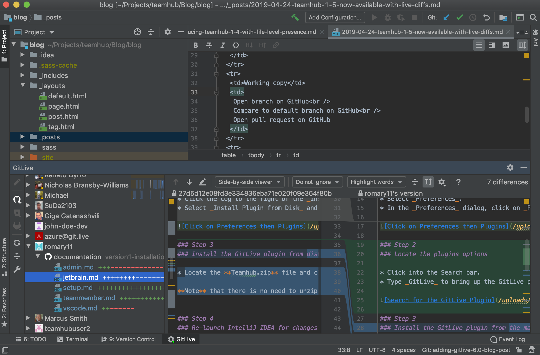 GitLive adds real-time code visibility on top of the git protocol and allows for a one-click pair-programming experience. - Check who is online from your team and which repositories, branches and issues they are working on. - Visualize the current state of your teammates’ local working copies to easily problem solve, before any changes have been committed. - No need to feel blindfolded, copy-paste code snippets, and tedious commit-push-fetch-merge cycles into IM conversations to make code easily visible for discussion. - Open a real-time view of the file they are working on and edit together seamlessly. - Privacy-first: Easily control what you share and when you want to share it with the click of a button.