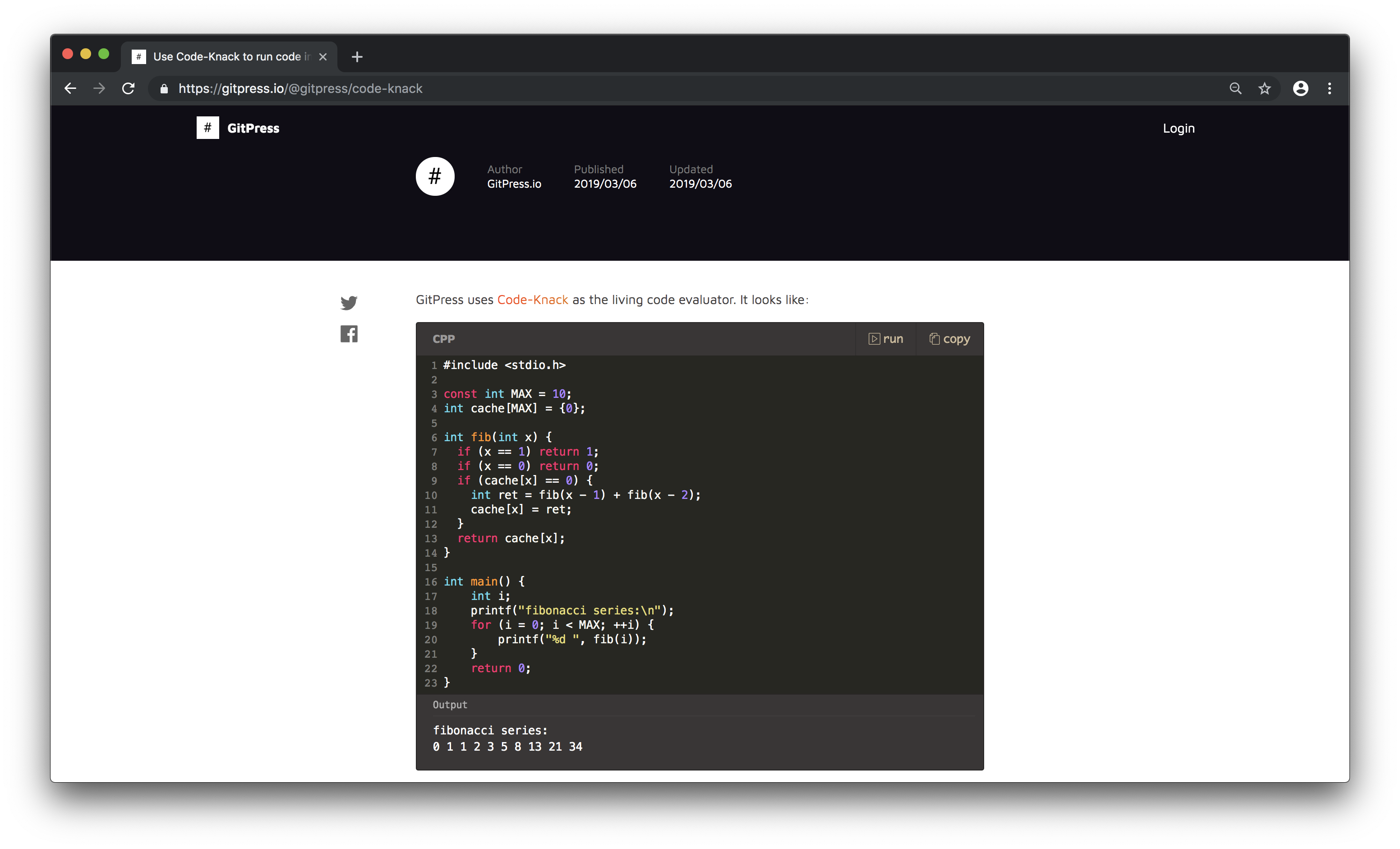 GitPress is built with modern developement tools chain you loved: - It uses Git to sync content - It uses Markdown as priority format - It transform code into living code evaluator, allow running code in posts