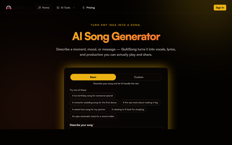 GoAISong is an AI-powered song generator that transforms text descriptions into complete, production-ready songs in seconds. Powered by advanced AI music models, it creates songs with real vocals, original lyrics, and full instrumental arrangements. What makes GoAISong different: instead of a one-size-fits-all generator, it offers 9 specialized music creation tools — each optimized for a specific use case. Create birthday songs for someone special, write a diss track to roast a friend, make an AI cover in a completely new style, compose a love song or wedding anthem, or generate rap tracks and lo-fi beats. Key features: • 200+ music genres and 100+ mood options • Basic mode (describe and generate) and Custom mode (write your own lyrics) • AI-powered lyrics generation • Voice library with multiple vocal styles • Full MP3 download with commercial license • No music skills required — just describe what you want Every new account gets 10 free credits to generate their first song. Paid plans start at $9.9/month for ~100 songs with commercial usage rights.