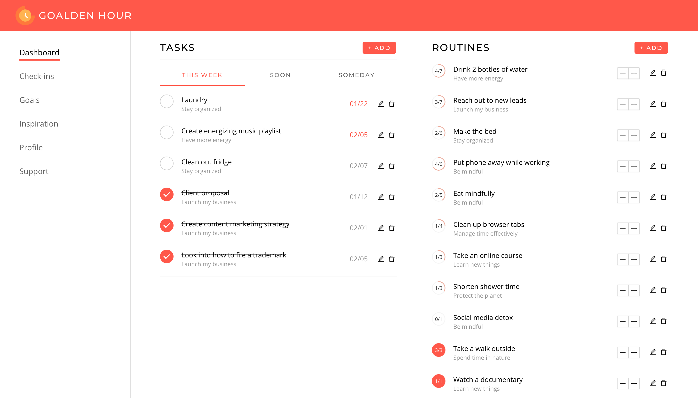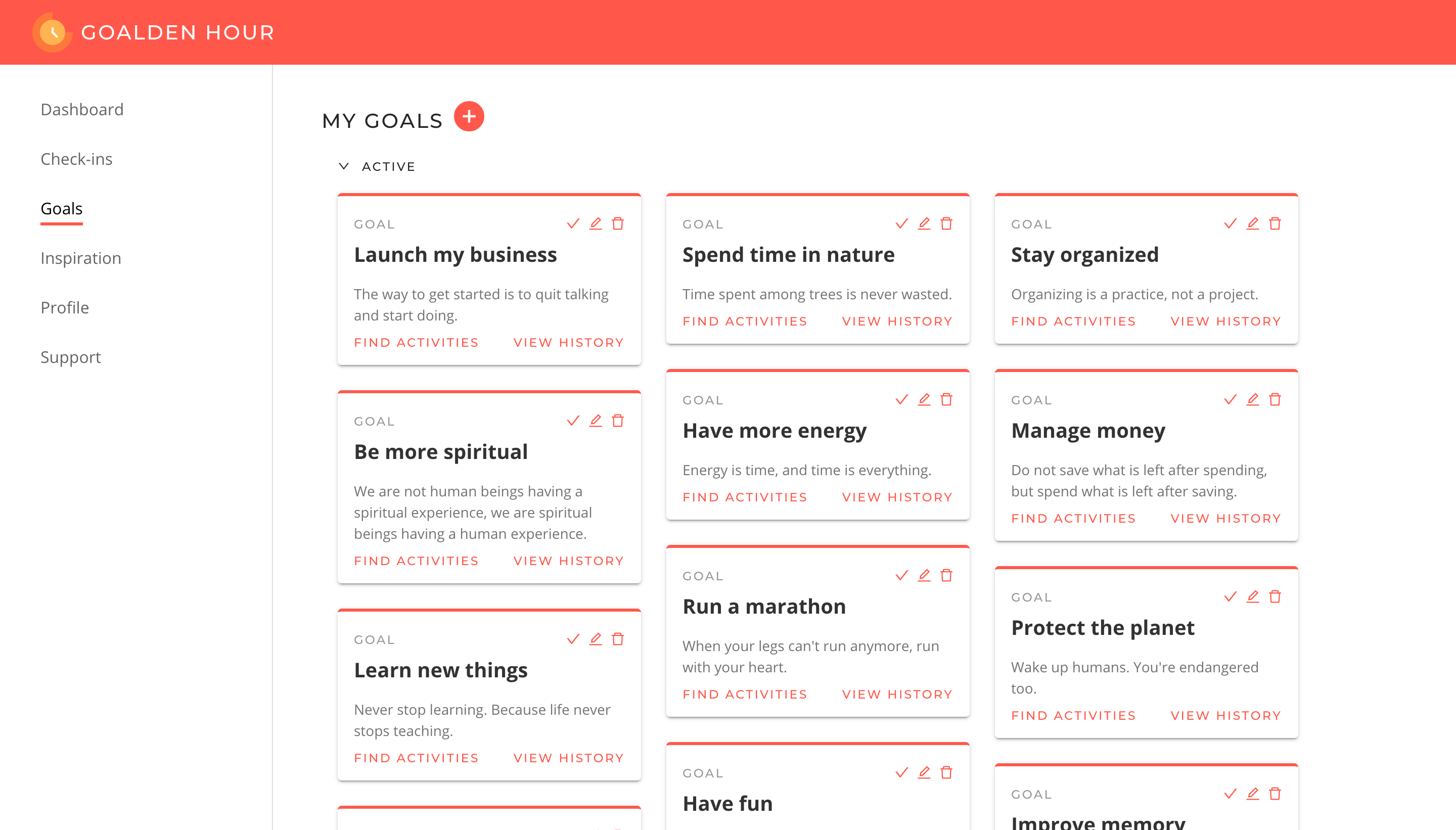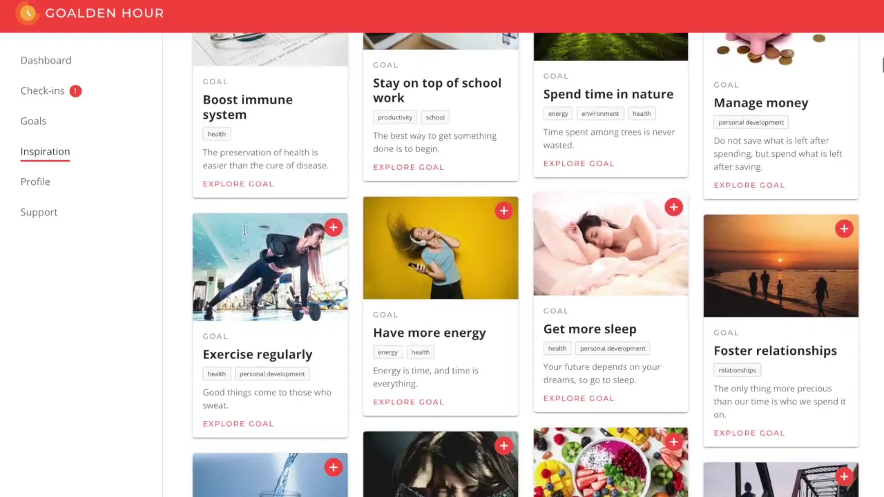 Goalden Hour helps people achieve success & wellness in their lives. We offer a goal-driven productivity tool that combines scheduling, task management, and self-improvement to allow people to manage their whole lives in one place and encourage them to prioritize and plan for the things that are truly important. We guide our users through planning & reflection and help them discover new ways to grow & improve. We also offer a free goal setting workshop to help you get setup and achieve your goals. Sign up at https://workshop.goaldenhour.com/