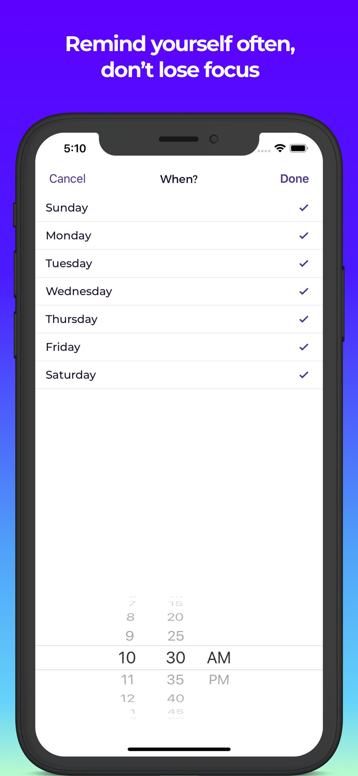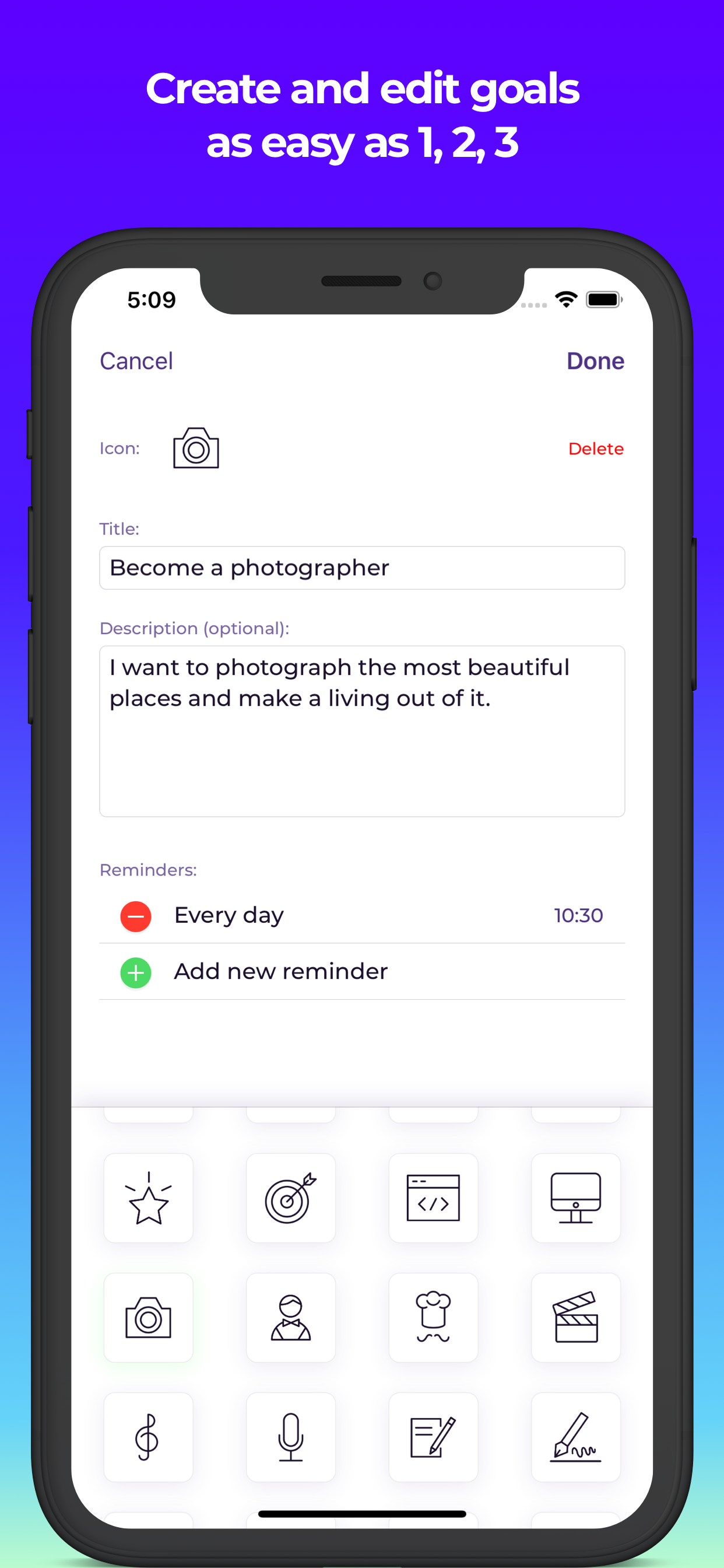 Goalee is not an app to check something off (to-do list) or track (habit tracker). Its purpose is to only and simply remind yourself of the path you want to walk on. One can think of it as the digital version of "write your goals on a sheet of paper and keep it somewhere you can see it every day". It helps you remind yourself where you should be heading. You envision yourself being wealthy in 20 years? Or maybe a public speaker? A great parent? A triathlon winner? Write down your goal, set one or more weekly/daily reminders and whenever the notification fires, do not dismiss it, do not ignore it, do not read it hastily. Read it as if it was the first time. Imagine yourself having obtained whatever goal you have in front of you. But don't stop there, or it would be pointless! Ask yourself, "do I act like that person"? Be completely honest with yourself and build up the identity change required, one baby step at a time; no step is too small to be unimportant.