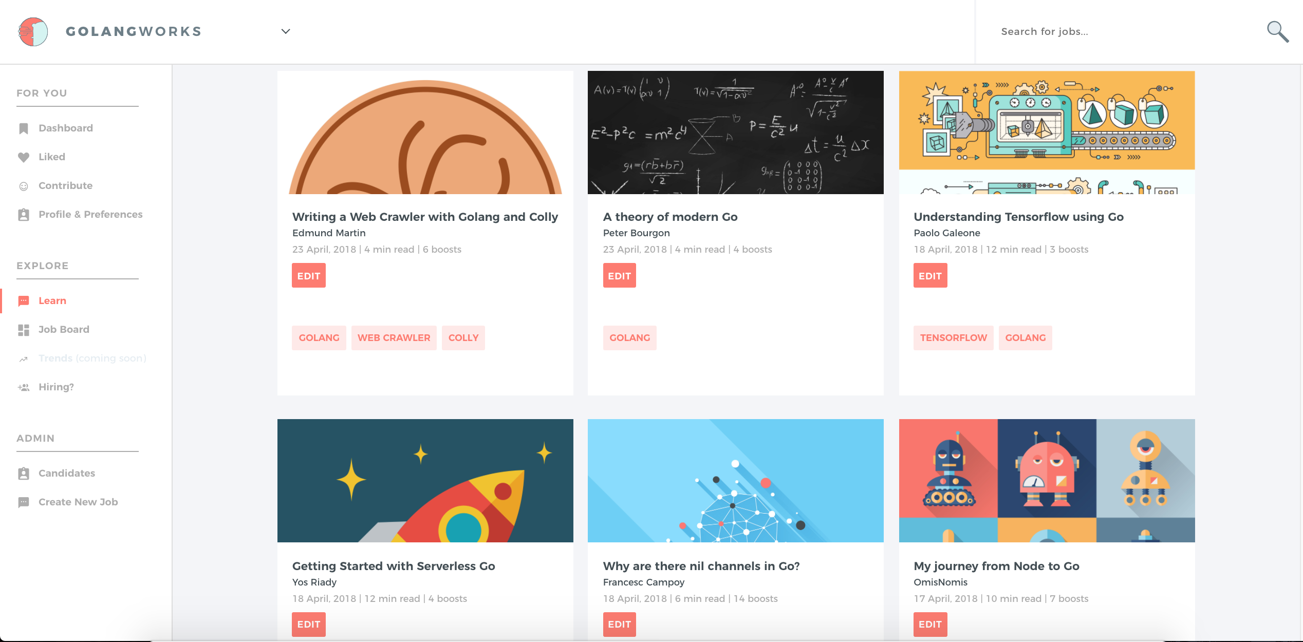 Golang Works is a platform and a hub to connect Go devs with exciting jobs and companies, as well as content. Part of the platform is a job-board and the content is a hosted in a Medium-like section called “Learn”, using markdown. Creating a profile is pretty straight-forward and we have decent UI. You can also sign up with your Github, which shaves 50% off from the process. Based on your skills and preferences, the platform will recommend you jobs and recent articles/blogs posted. After your profile is approved, you’ll get access to: * Company name and detailed information * Like/boost content on the platform and show your appreciation to the author :slightly_smiling_face: * Accurate salary, perks, bonus info * Pin jobs to create your own personalized board You can still see searchable job info before signing up, but the functionality is restricted.