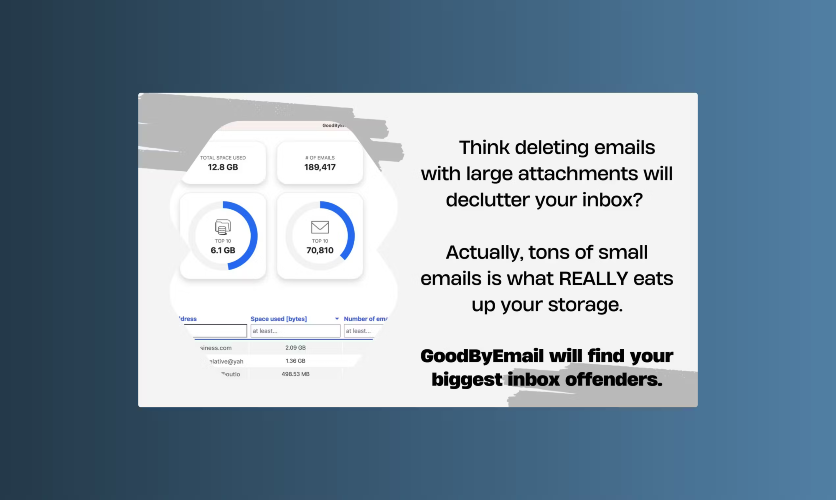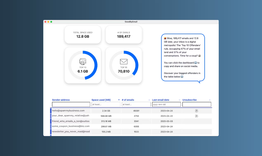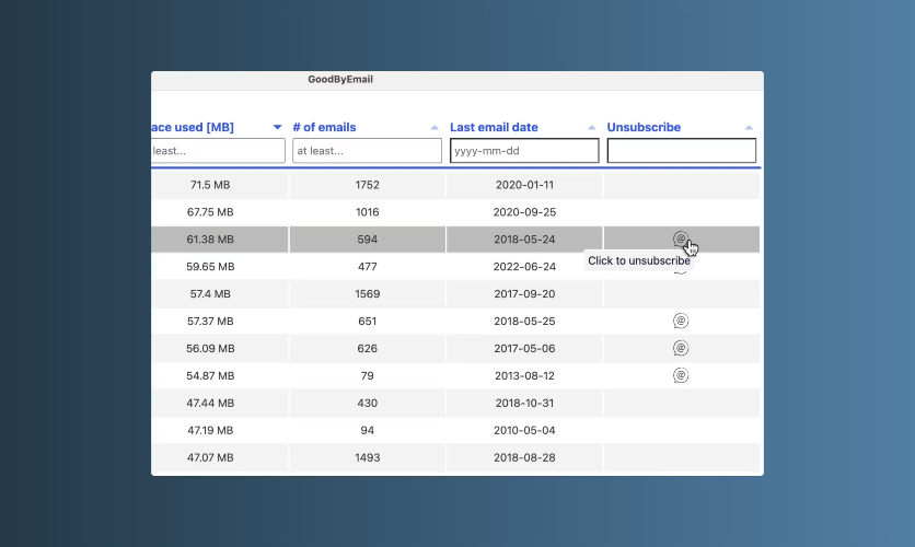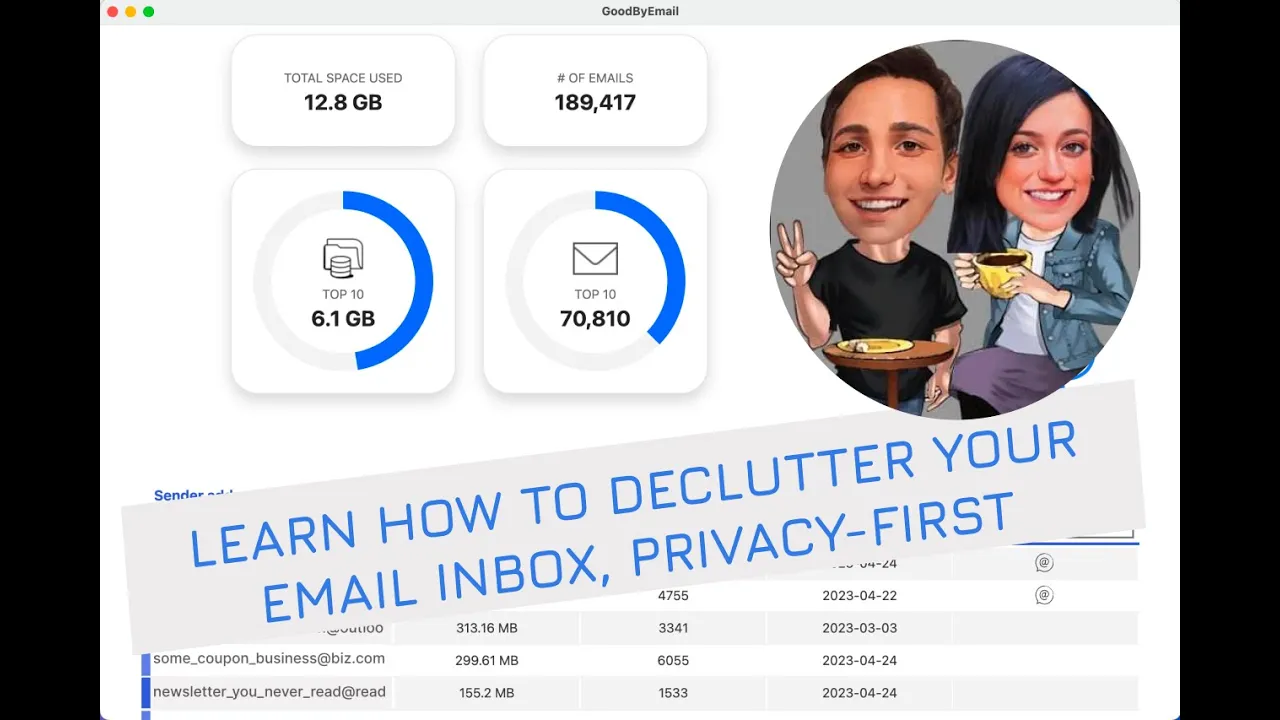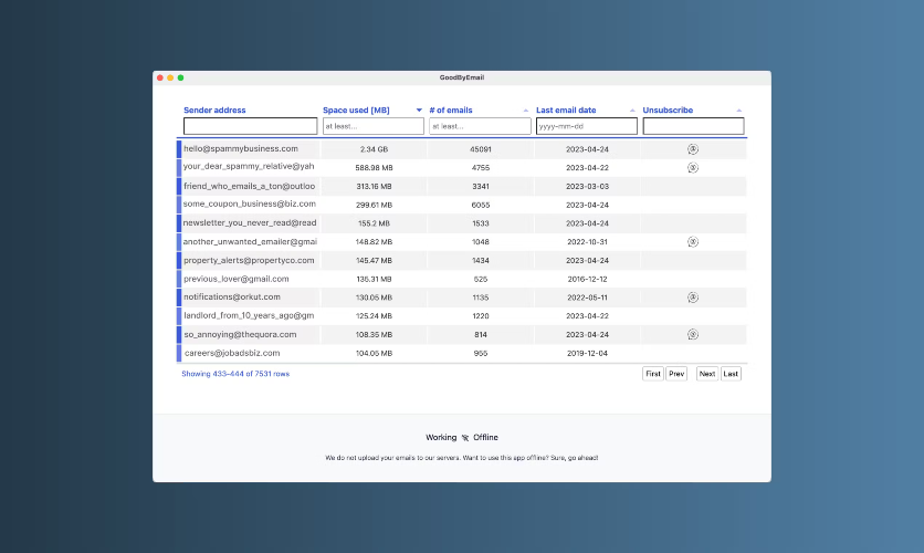 GoodByEmail stands apart from other inbox cleaning tools by not requiring you to grant access to your email account. You don't have to "trust" GoodByEmail, since, by design, your emails are never uploaded to GoodByEmail's servers. No OAuth, no third-party permissions. You can even run the tool offline. Addressing the Real Inbox Challenge: Most inbox cleaning tools focus on unsubscribing from mailing lists, which is great for stopping future clutter but doesn't necessarily help with the heaps of old emails already in our inboxes—many of which aren't even from mailing list senders. GoodByEmail's inbox analytics feature addresses this challenge by showing users exactly who their biggest inbox space offenders are and how much space all those smaller emails take up. Oh, and of course, you can also unsubscribe from pesky mailing lists. *Works with all email service providers and your business email account, not just Gmail.
