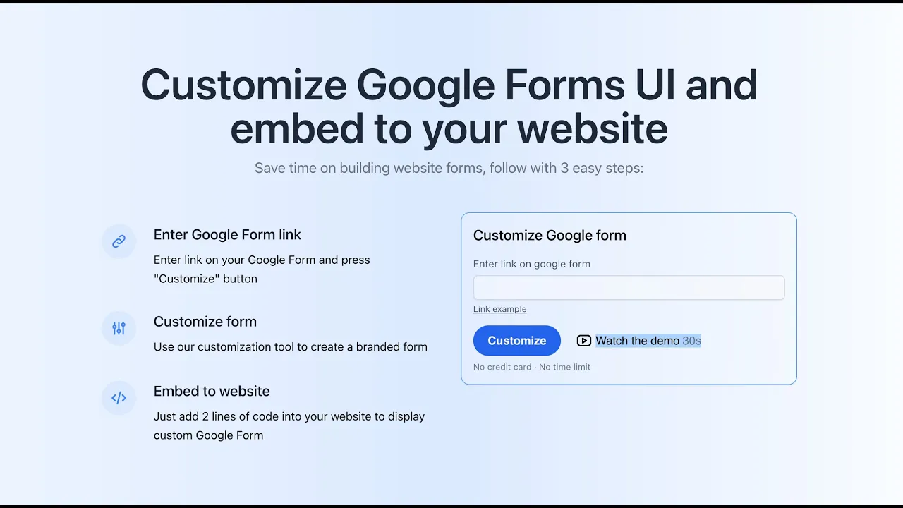 Customize Google Form UI and embed to your website in minutes. Save time on building website forms with 3 easy steps: 1. Enter Google Form link 2. Customize form 3. Embed to website Supported platforms: WordPress, HTML website, React app.
