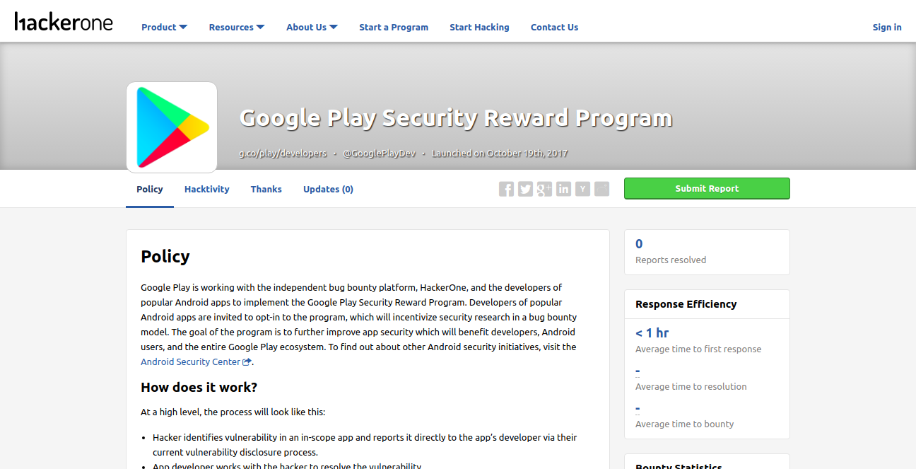 Google Play is working with the independent bug bounty platform, HackerOne, and the developers of popular Android apps to implement the Google Play Security Reward Program. Developers of popular Android apps are invited to opt-in to the program, which will incentivize security research in a bug bounty model. The goal of the program is to further improve app security which will benefit developers, Android users, and the entire Google Play ecosystem.