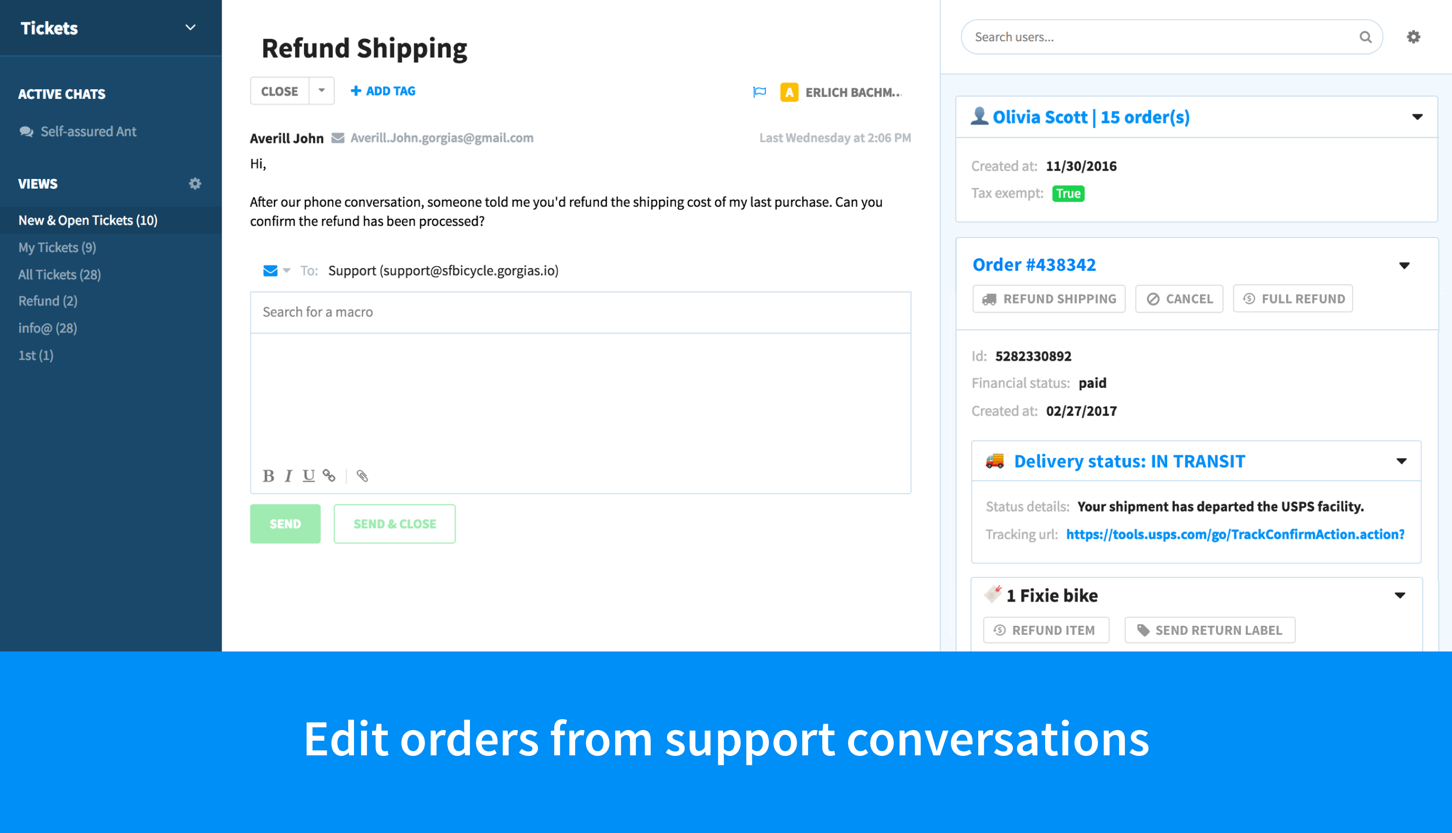Gorgias is a helpdesk which helps teams manage all their customer support in one place. You can connect all your channels: email, chat, facebook, etc. When a customer contacts you, your team sees their latest orders, delivery info, and any customer data you’d like. Then, they can edit orders, issue gift cards or refunds in one click. You can connect ANY app to Gorgias. Your agents save time. This way, your team provides a better customer experience.