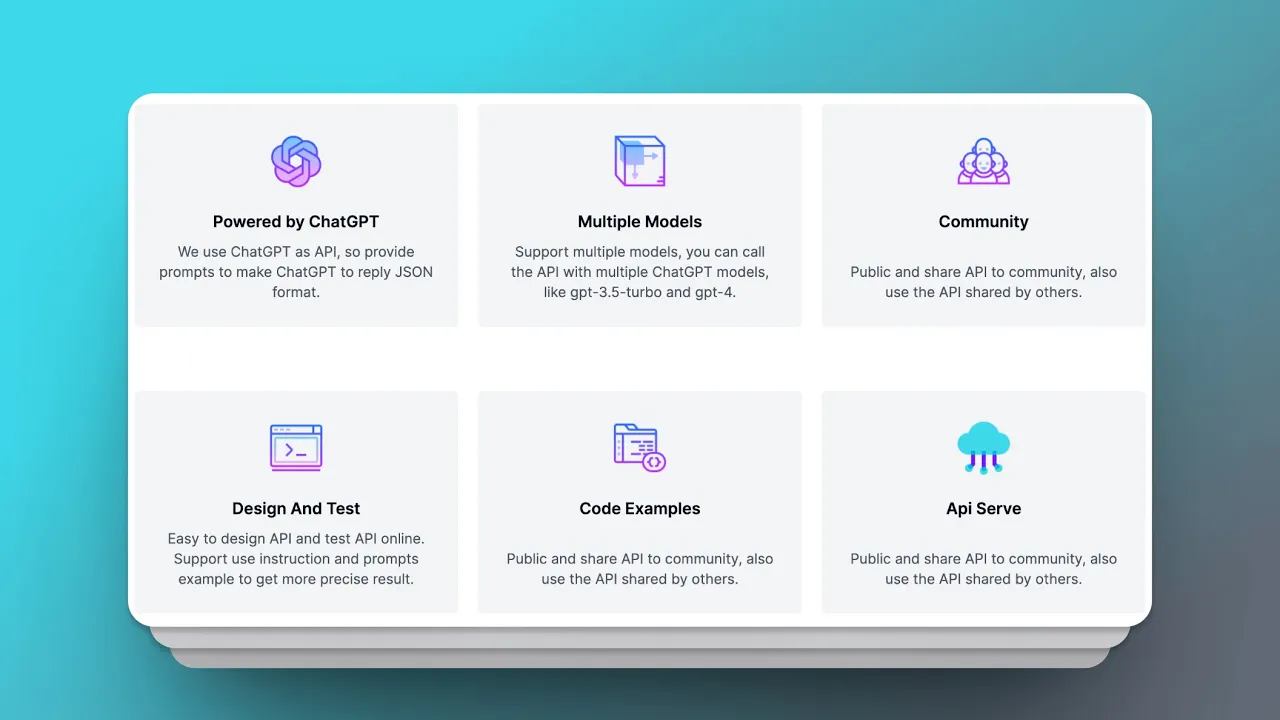 GPT2API is a platform to help you build API to make ChatGPT easier to use. You can build API and share it with the community, or you can call API from API.Hub, which is other API shared by the community. Features: Build API with ChatGPT commands. Test API on the website. Share it with the community. Have the community extend the API. Sample code for your project. Cheap price for calling ChatGPT, $1 with 600K tokens.