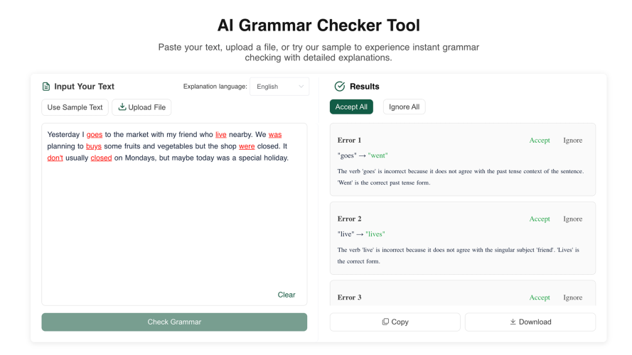 AIGrammarChecker is an AI-powered tool that automatically detects and corrects grammar, spelling, and style errors to help users write clear and polished content. - Real-Time Grammar and Spelling Correction: AIGrammarChecker identifies and fixes grammar, punctuation, and spelling mistakes instantly, ensuring error-free writing. - Writing Style and Clarity Enhancement: The tool provides suggestions to improve sentence structure, readability, and overall writing flow, helping users communicate ideas more clearly and professionally. - Academic Writing: Students and researchers can use AIGrammarChecker to proofread essays, reports, and assignments, ensuring their work is grammatically correct and well-structured. - Professional Communication: Professionals and content creators can polish emails, articles, and social media posts, improving clarity, readability, and overall presentation of their written communication. - Error-Free Writing: AIGrammarChecker addresses the need for accurate, mistake-free writing by automatically detecting and correcting grammar, spelling, and punctuation errors, helping users produce professional-quality content. - Clear and Effective Communication: It meets the demand for improved readability and writing style, enabling users to express ideas more clearly, persuasively, and confidently across various documents and platforms.