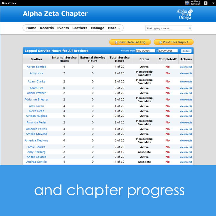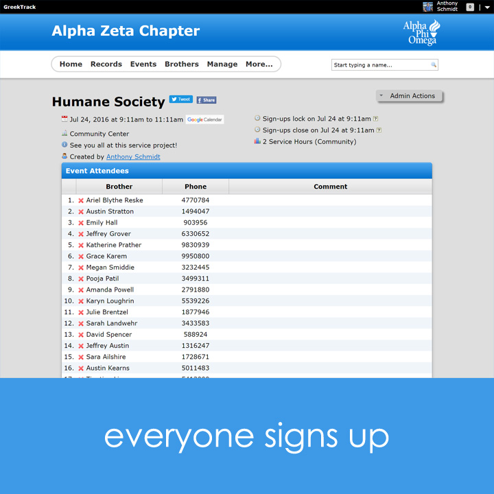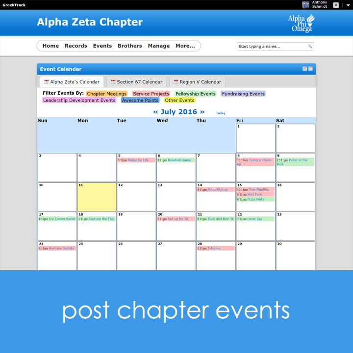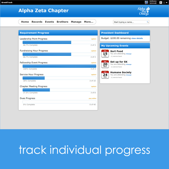 Managing a fraternity or sorority chapter can be overwhelming. Introducing GreekTrack, a complete chapter management service designed to rid chapters of paperwork and other distracting tasks so chapters can focus on what matter most: doing more service in local communities. Manage events, membership, collect dues & fees, give awards, set achievements, upload documents, mass SMS, and much more. Visit https://www.GreekTrack.com for a free semester trial!