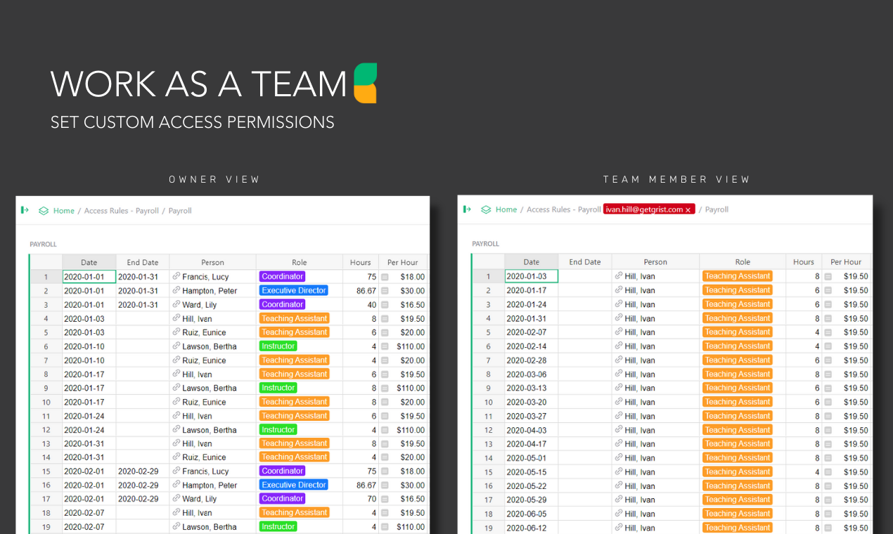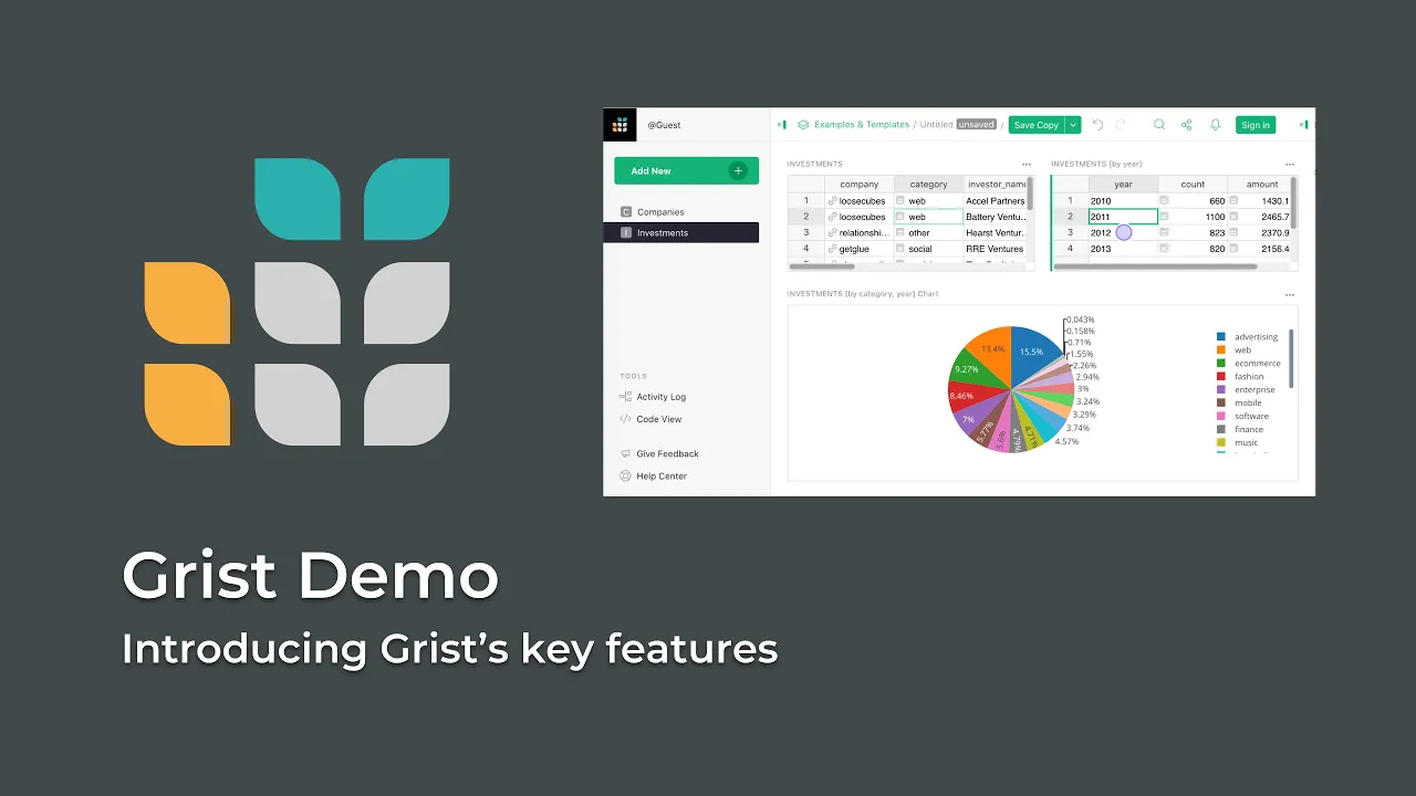 - Build your own relational spreadsheet in minutes — no code necessary. - Customize each page of your Grist database into an app-like dashboard. You can transform tables into easy-to-read data cards or colorful charts, or create your own custom widgets. - Drill into your data with dynamic charts and reports that update as you slice and dice data with the click of a mouse. - Tame large data sets into summaries that highlight key figures that lead to informed decision making. - Share your data in part or in full, and collaborate in real-time. - Control you data with access rules that determine who can see or edit which parts of your data — down to each column and row. - Analyze data with formulas written in Python or Excel-like functions. - Export Grist tables as a .csv or download the entire relational database as a SQLite file. - Integrate Grist with other tools using Zapier or our API. We built Grist because we believe software can have a profound impact on people's lives. Our hope is that with Grist, you are empowered by your tools, not limited.