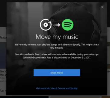 Groove Music partnering with Spotify to bring the world’s largest music streaming service to you. We know that access to the best streaming experience, the largest catalog of music, and a variety of subscriptions are on the top of your list. Now you can move your curated playlists and collection from Groove directly into Spotify. Groove Music Pass users eligible under Spotify’s terms will also be able to receive 60 free days of Spotify Premium.