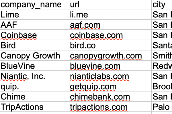 Growjo is a free exportable list of the 10,000 fastest growing companies in the world. It also contains a free api.