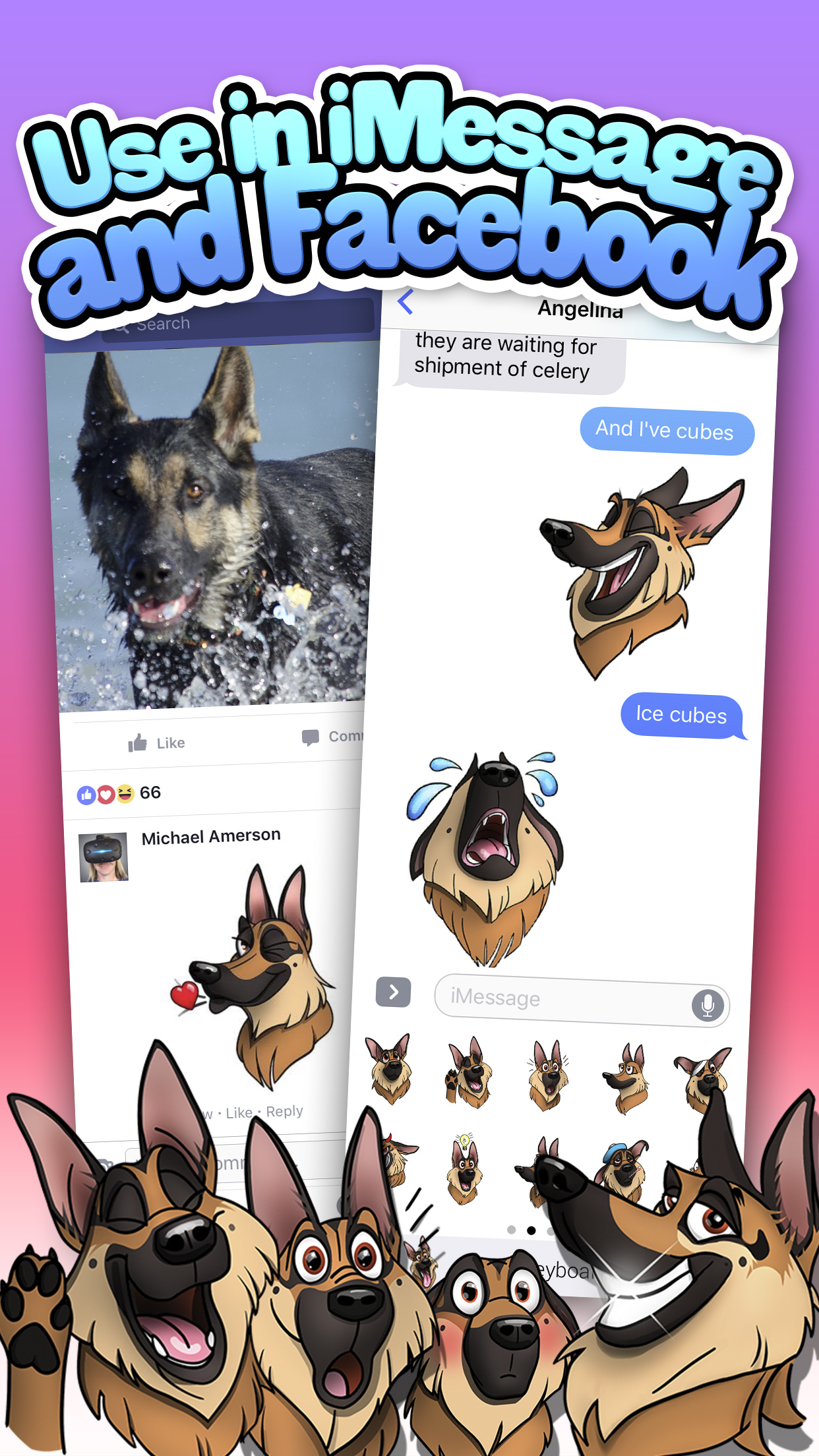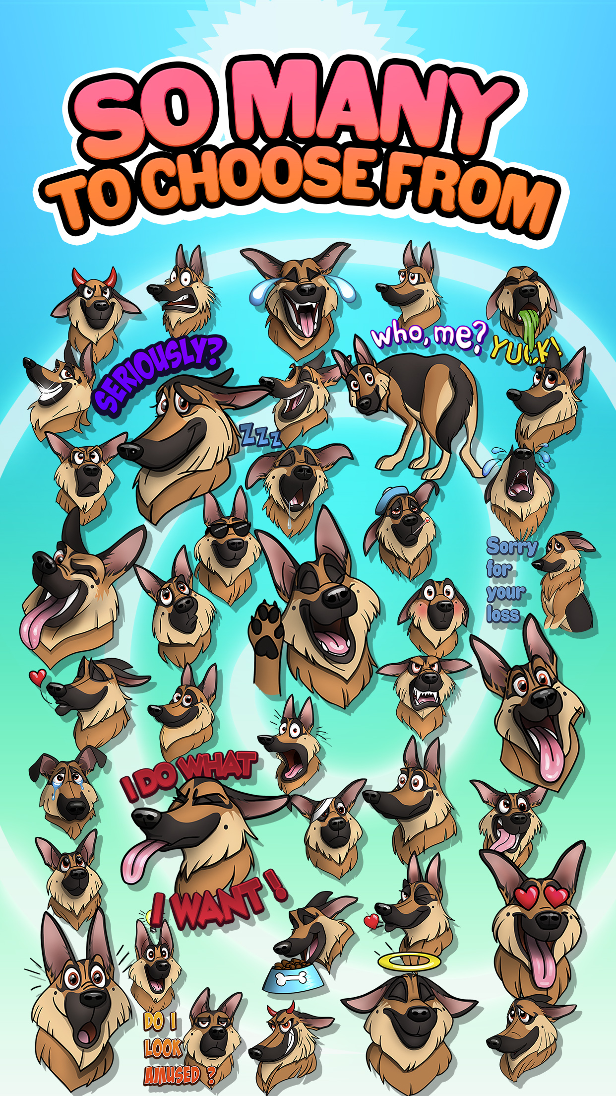The top German shepherd emoji and sticker app for German Shepherd lovers worldwide. GSDmoji offers high quality, Hand Drawn, German Shepherd emojis with the most wonderful and expressive moods! Express your love for the breed with these colorful and stunning stickers, created by a professional cartoon artist! View and send them via SMS text, and in any social media application as photos. Made by a GSD lovers for GSD lovers. Features: * Beautiful GermanShepherd stickers! * Designed by a professional cartoon artist * iMessage Sticker Support * Quick & simple installation * Works in Facebook & other social media apps * Use on both iPhone & iPad Show your German Shepherd pride and love for the breed. Download and start having fun with them today!