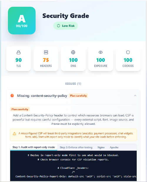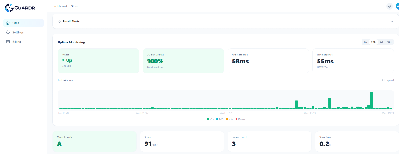 Guardr monitors your website's security headers, SSL certificate, DNS configuration, uptime and more — all in one dashboard. Unlike uptime-only tools, Guardr gives you a security grade (A–F) with platform-specific fix instructions for Cloudflare, Nginx, and Apache. Free plan available.