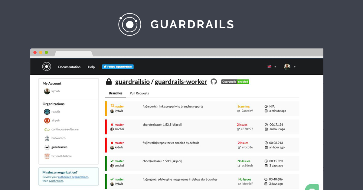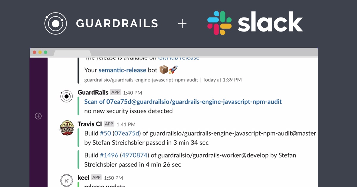 GuardRails scans new code changes as they occur in your repositories. For pull requests, we will post comments whenever security issues are detected. For branches, you will be able to see reports in your dashboard. We currently support statical code analysis and/or vulnerable dependencies checks for JavaScript, Python, Ruby, Solidity, Go, PHP, and Java. However, GuardRails can be used on any kind of repositories to prevent secrets leakage thanks to our secrets detection engines. We are working on adding support for C#/.NET next. GuardRails works out of the box, no configuration required. However, if you want a custom experience, please refer to our documentation for the configuration options. For example, you can already integrate GuardRails with Slack to get the right notifications right where you are used to getting them.