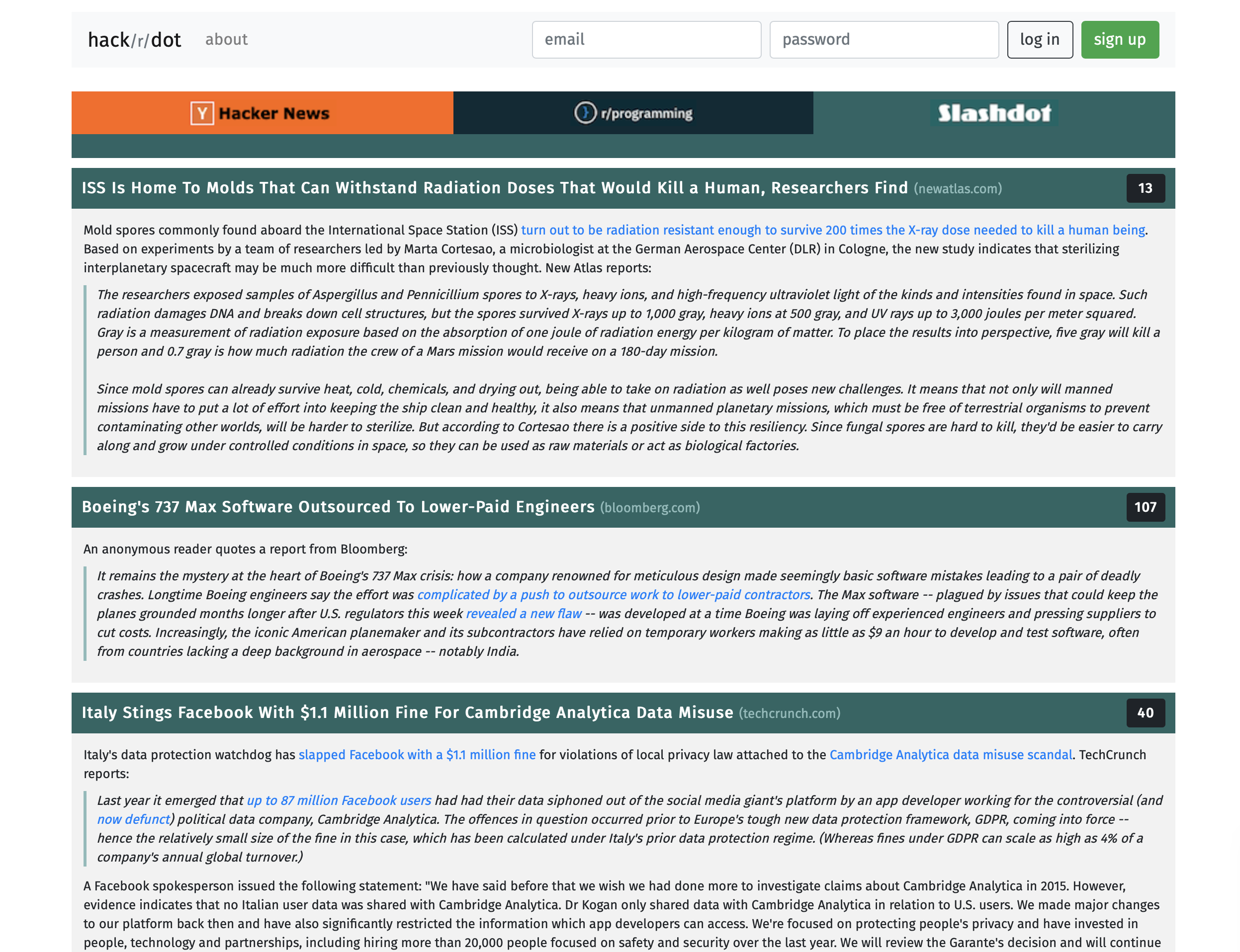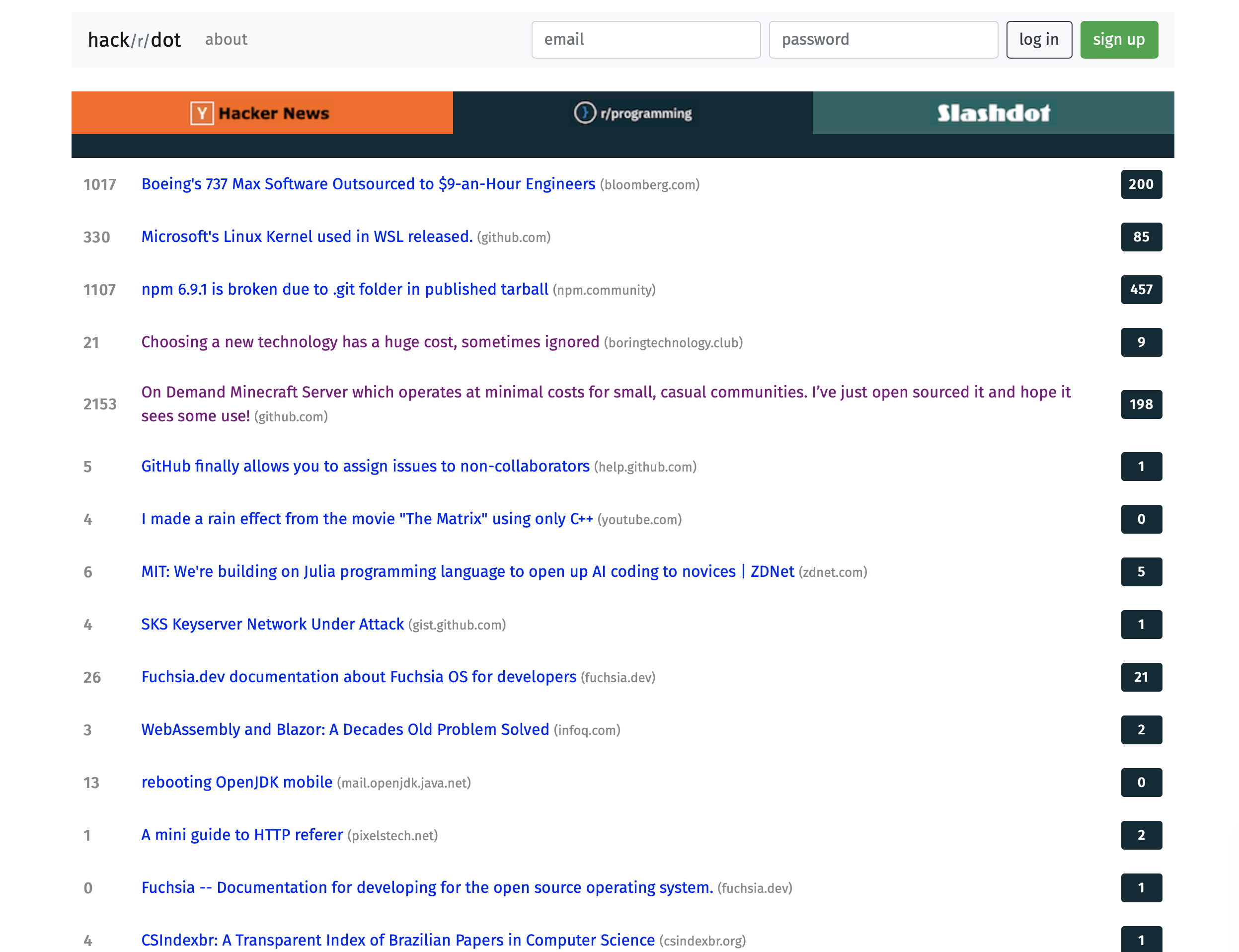 Hackrdot is a reader for Hacker News, r/programming, and Slashdot. Users can bookmark posts and join a curated weekly mailing list.