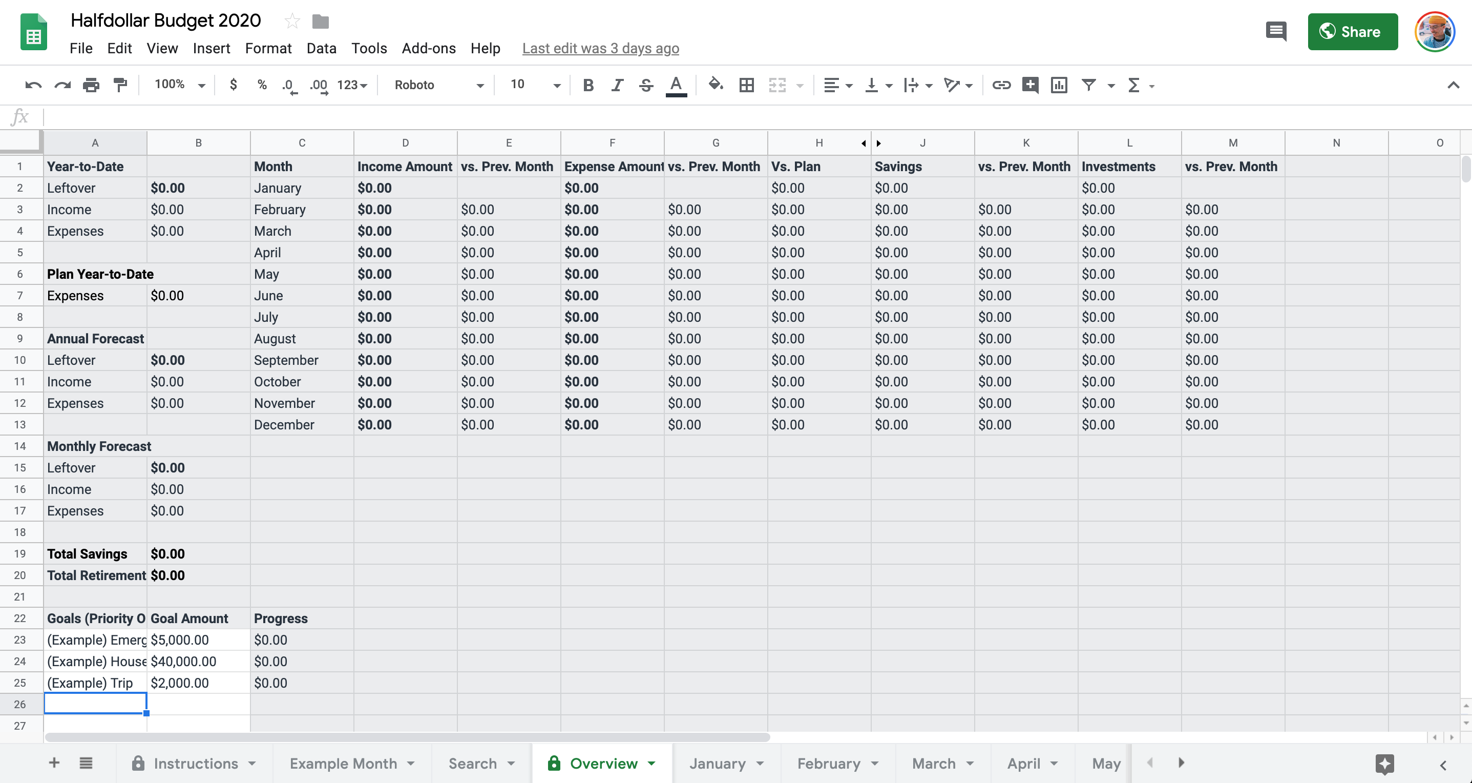 Halfdollar is a free spreadsheet budgeting tool with many features to help meet your individual budgeting needs. It's shareable, easy to log and organize your transactions, and helps you predict what the each month and the entire year will look like financially. There's something about manually logging and handling your budget when it comes to your finances. You decide exactly how everything is labeled and categorized, and can constantly see what is coming in, going out, and what is leftover.