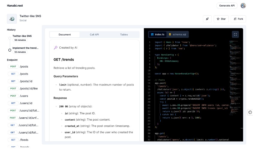 Hanabi.rest is a web application that leverages AI technology to generate REST APIs and SQL based on Hono.js from prompts and screenshots, significantly accelerating backend development. This application allows users to verify API functionalities directly connected to the data layer through a browser, greatly enhancing the development process. Hono.js is optimized for web standards and edge runtimes, and can be deployed in various environments such as Cloudflare, Fastly, Deno, Bun, Lagon, AWS, and Node.js. The APIs created can be shared through links, allowing community members to contribute to the improvement of the application by starring and forking. The import of npm packages is also supported, with automatic addition of types to the editor. Moreover, it's possible to automatically generate APIs using AI through a link to the interface generated from Vercel's v0.dev. The generated APIs can be deployed directly to Cloudflare with just a few clicks, allowing for easy integration into production environments. A dedicated CLI is also available to assist with project setup and local development progress.