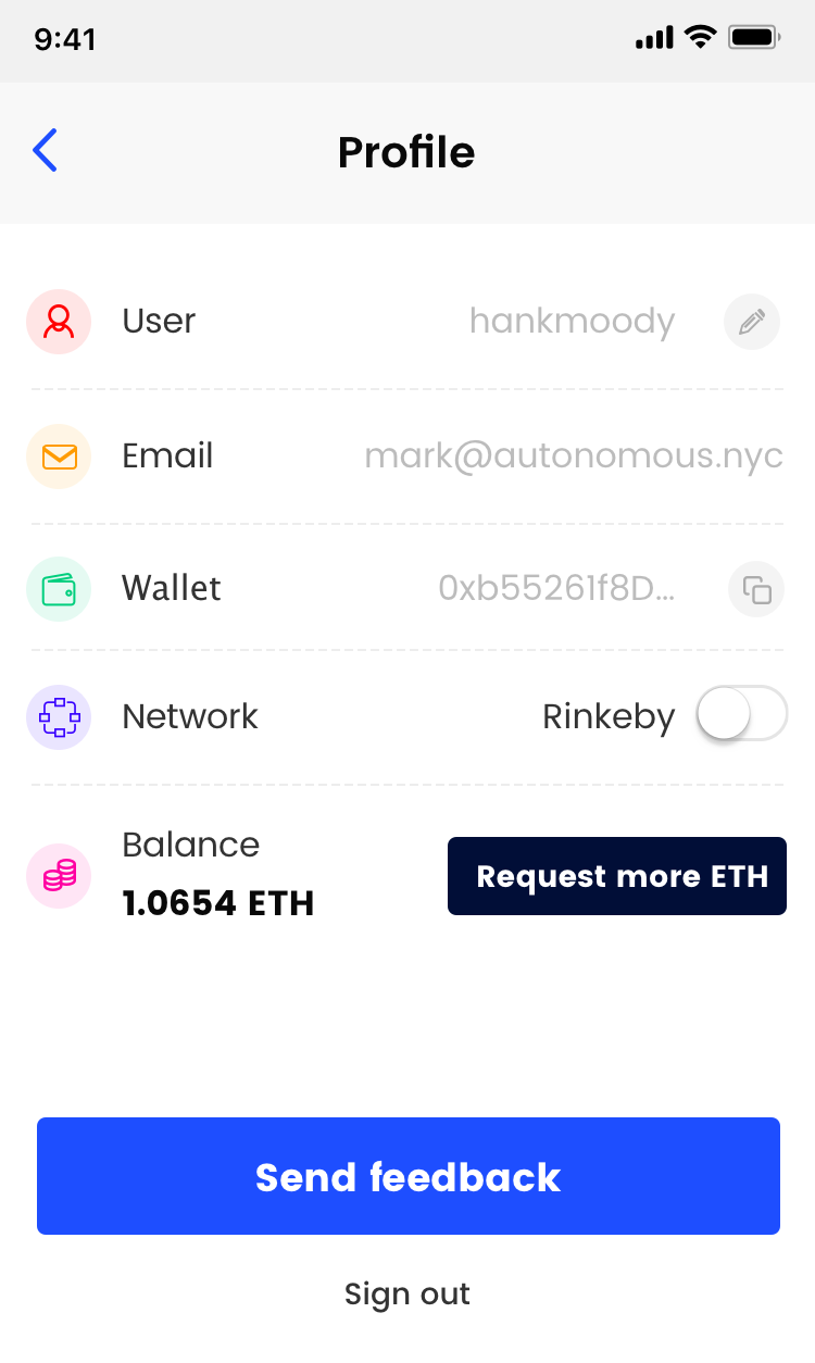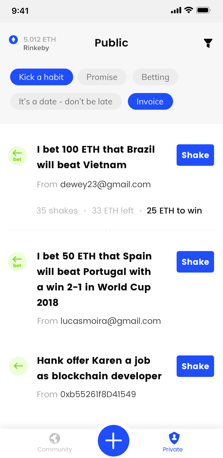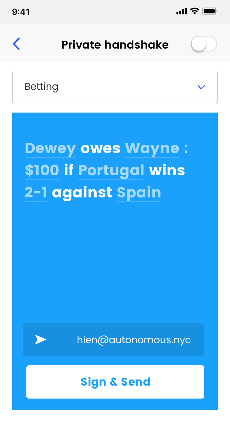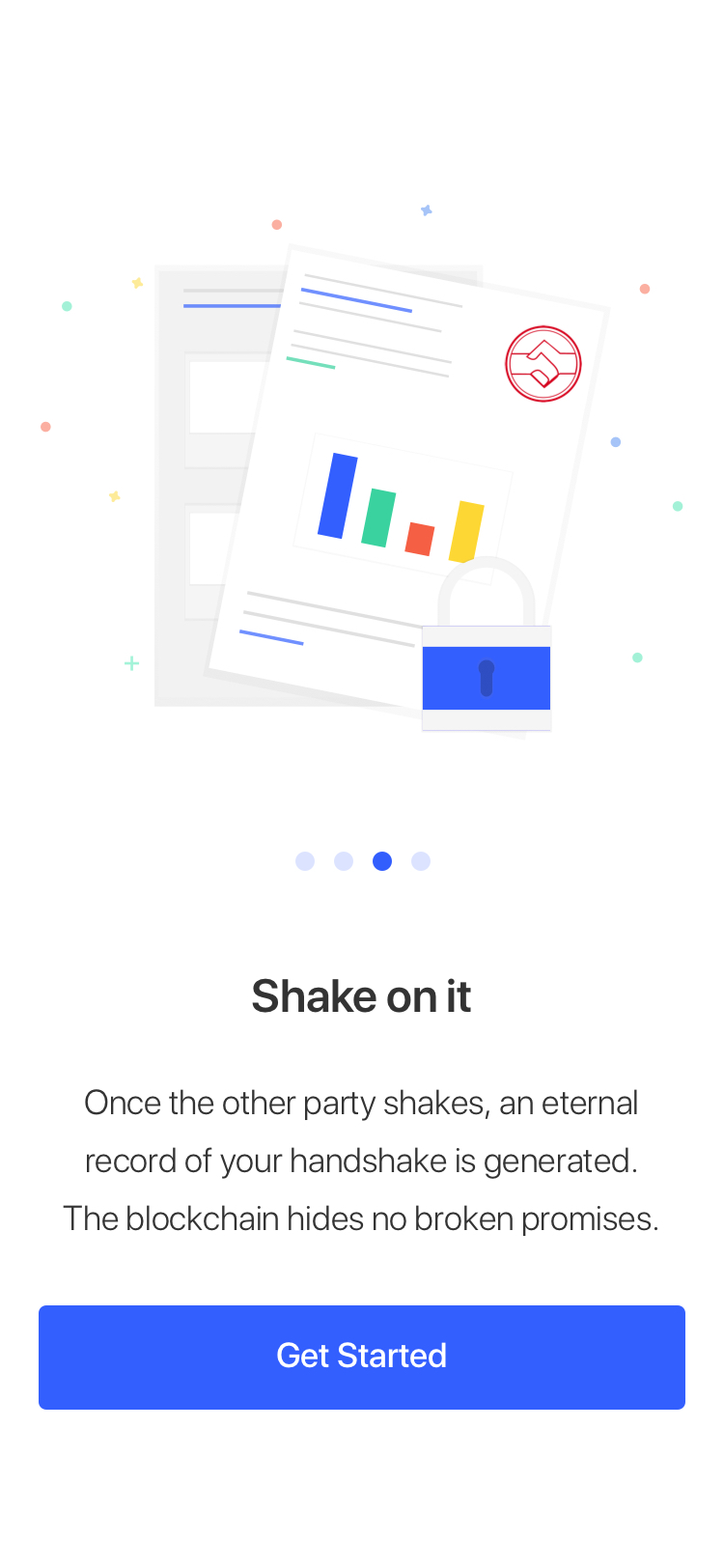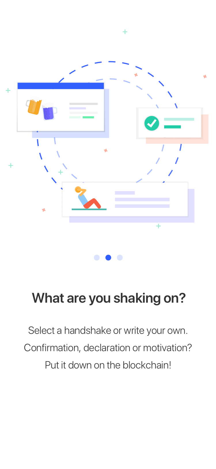 Handshake is a dApp that immortalizes promises on the blockchain - as easy as creating a text. Designed to put trust back into agreements and make the e-signature obsolete! That includes IOUs, friendly bets, invoices, investment offers, casual memos and more official pdf contracts - absolutely anything that you'd shake on in real life. Why put it on the blockchain? So there's a permanent, immutable record, secured with military grade fraud prevention. No more he said she said! We are currently in beta on the Rinkeby testnet (all accounts get 1 test ETH), but all users have the option to toggle onto the mainnet as well. Join our cosy telegram group: https://t.me/autonomousdotai for private beta access. Please share your ideas - we'd love to build them :)