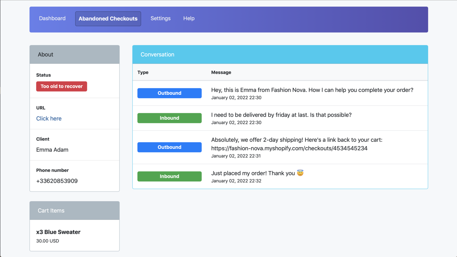 Happy SMS is an SMS cart recovery tool for Shopify stores. Instead of sending an automated sequence of SMS - that won't convert - we will reach out to your customers manually, one by one, via SMS to try to close the sale for you.