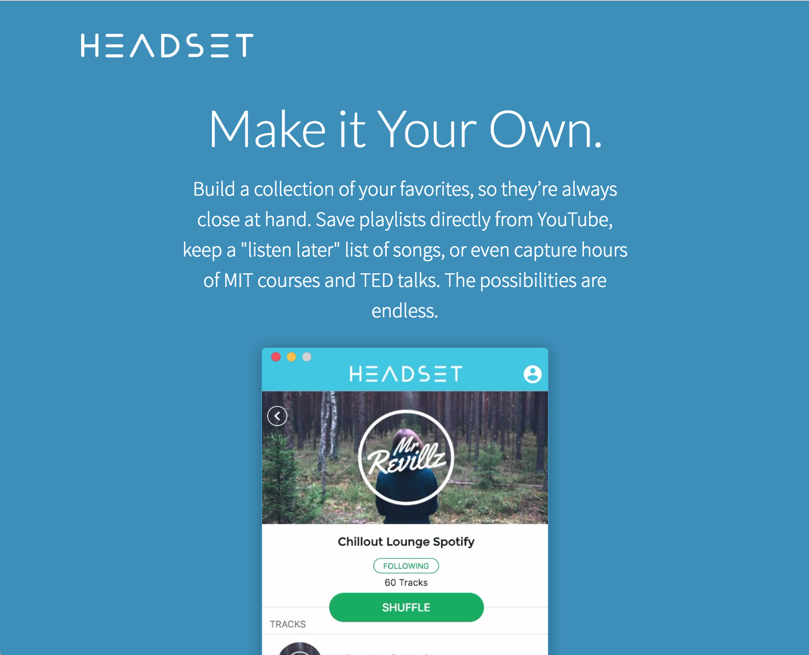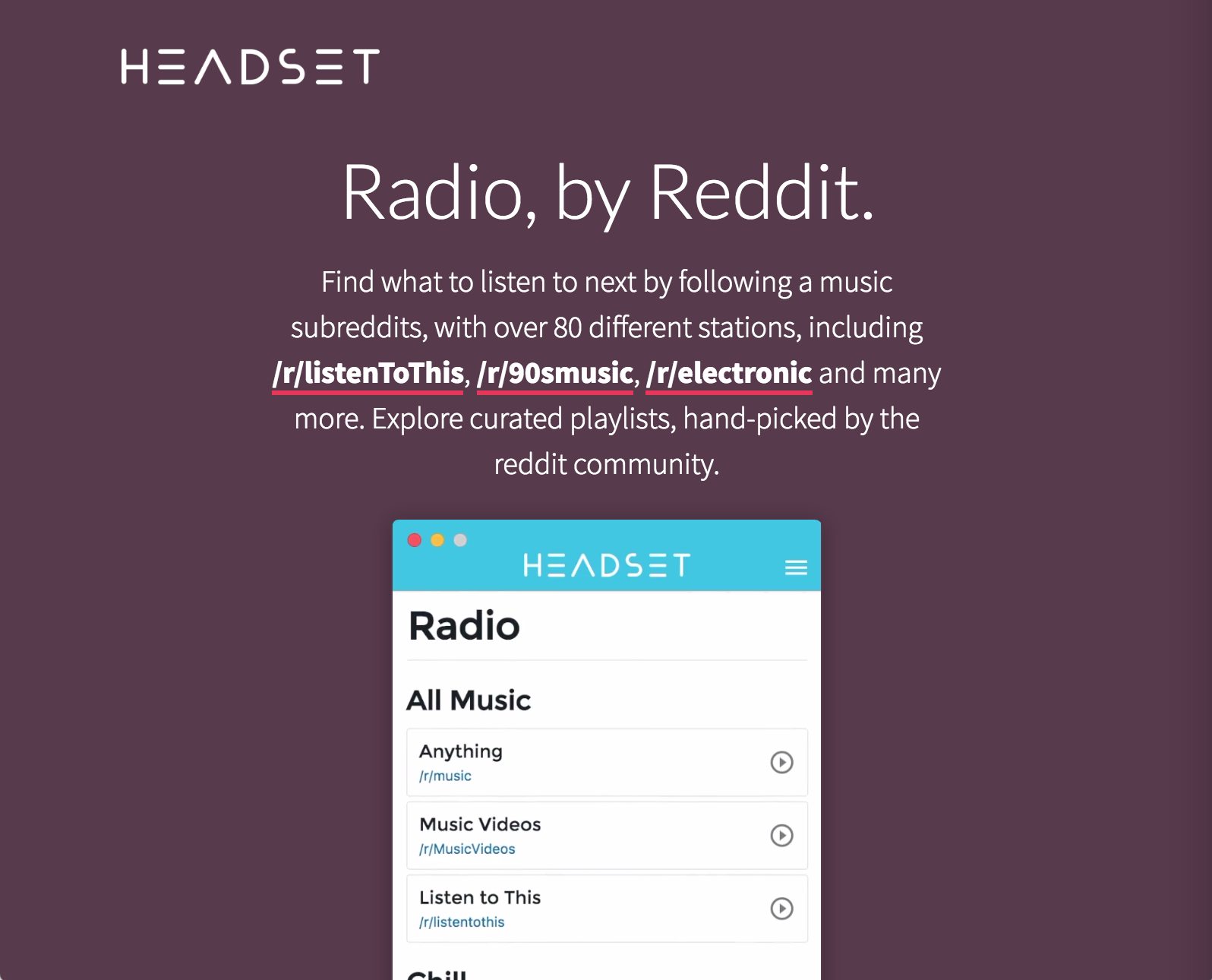 Headset is a simple music player for Mac, Windows and Linux with integrated YouTube search, a home screen with popularity list by genres and eras, and best of all, a radio powered by Reddit. Headset takes the songs that are shared in over 80 music subreddits, categorize them and plays them automatically. It's a great way to find new music and a pretty unique one as it is chosen by other humans like you, not by algorithms. You can listen to all the music you want without having to do more than installing the app on your computer. In addition, you can create collections, playlists, scrobble to last.fm and bookmark your favorite with a single click.