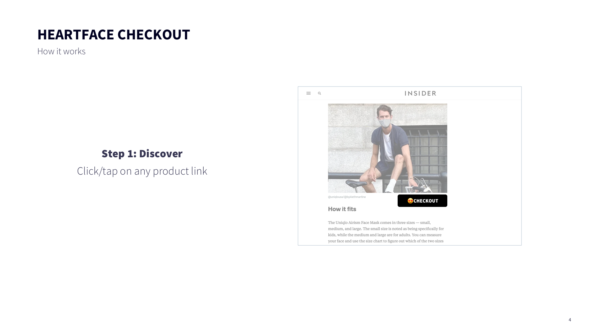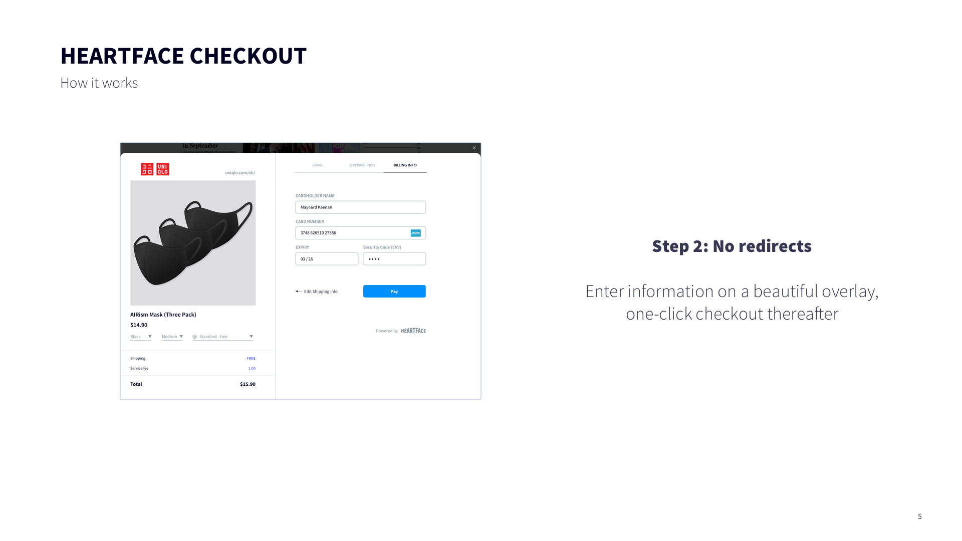 Heartface is a frictionless checkout that enables e-commerce for any product link; letting people shop multiple products from multiple stores without being redirected out of a referring website/app.