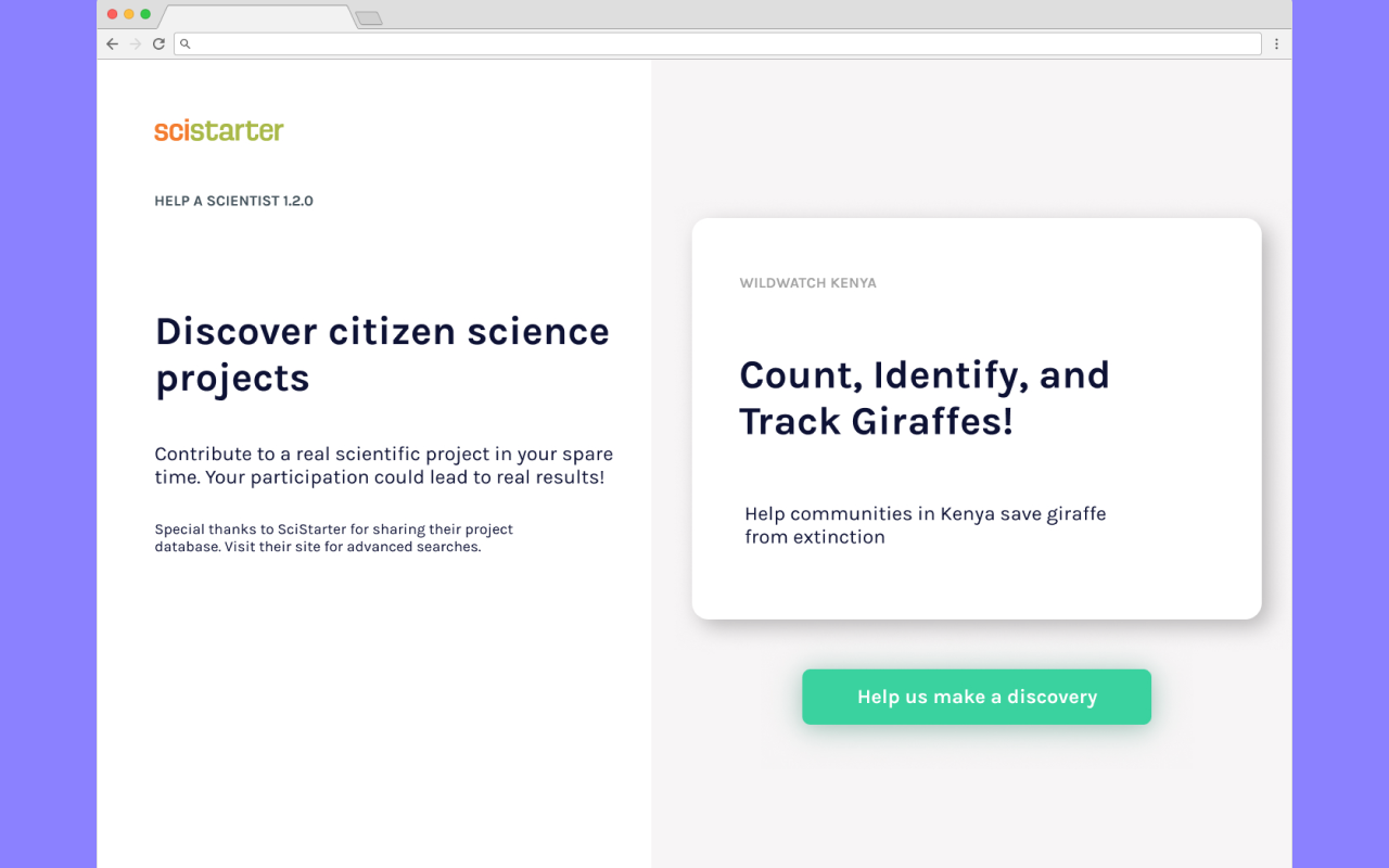 Get it here: https://chrome.google.com/webstore/detail/help-a-scientist/bplkoafhogcpnogadljgjecpnfhhbbpc Discover ways to advance science in your new tab Help a Scientist replaces the new tab of your browser with an opportunity to participate in a citizen science project. Each time you refresh the page or open a new tab, there will be a new fun task waiting for you. If something catches your eye, simply clicking the button will take you to the SciStarter page to tell you exactly how to contribute to the project. Your contribution may help real researchers obtain real results!