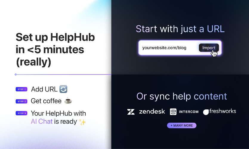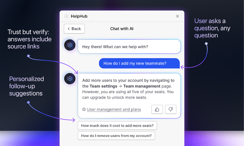 HelpHub is AI chat + search for any website or web app. Just add source content (via URL, copy/paste, or sync with a CMS). The chatbot is then "trained" on that content and will answer question's based on that content only. The output is an embeddable widget that contains two things: (1) the chatbot interface for user's to ask questions; and (2) a search interface for users to search through the content the bot is trained on directly, as well as view source content.