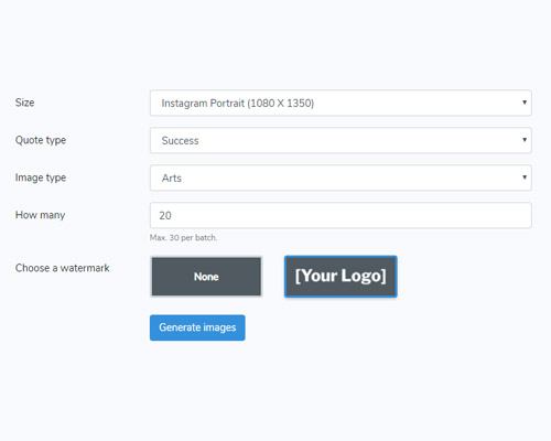 This tools automatically creates branded quote images based on set parameters. Once the images are created you can select which ones you want to keep and which ones to discard. The aim here is to help you keep your social channels active even if you don't have a lot of time or budget for that.