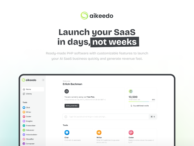 Ready-made PHP software with customizable features to launch your AI SaaS business quickly and generate revenue fast. Aikeedo is a complete, white-label AI platform that you can install on your own domain and sell as your own service. This all-in-one software seamlessly integrates leading AI technologies, including OpenAI, Anthropic / Claude AI, Cohere, ElevenLabs, and StabilityAI. It is a perfect solution for businesses seeking robust, scalable AI capabilities. Crafted in pure PHP, ensuring a versatile and powerful platform for a wide range of AI-driven services.
