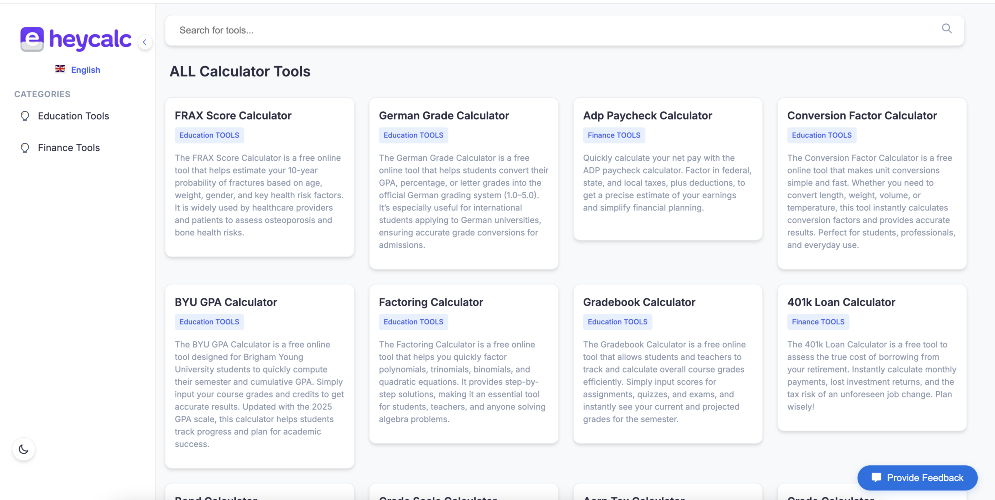 A professional platform integrating educational and financial calculations. From GPA calculators and salary tax estimates to complex math formulas, HeyCalc provides accurate, instant results for students and professionals.