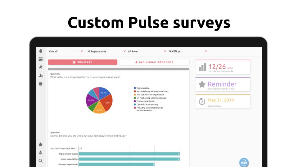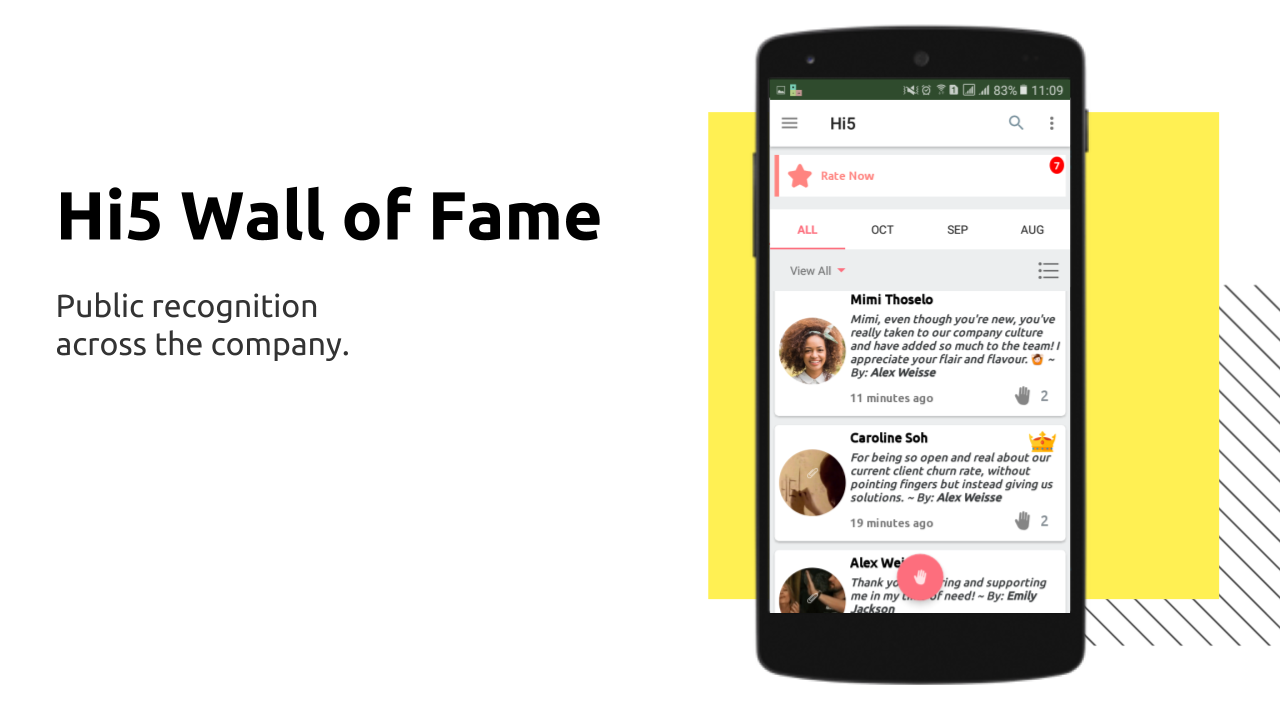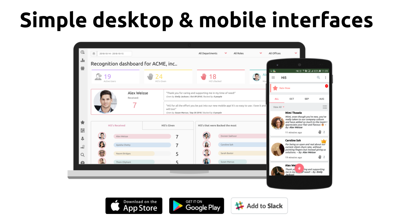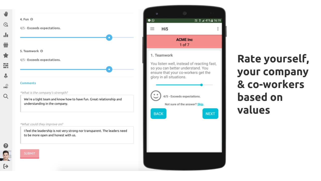 Hi5 makes it easier for people to manage people. It's a simple, easy cloud solution that enables employees within companies to recognise and review each other to free up management and HR teams from laborious admin. You can use Hi5 to measure Appreciation, Goals, Culture and Happiness in your company by allowing employees to give continuous feedback. Get feedback through running reoccurring reviews and pulse surveys, as well as sharing recognition through giving Hi5's. There's so much more under the hood ? check out our other features at www.get5.io/product